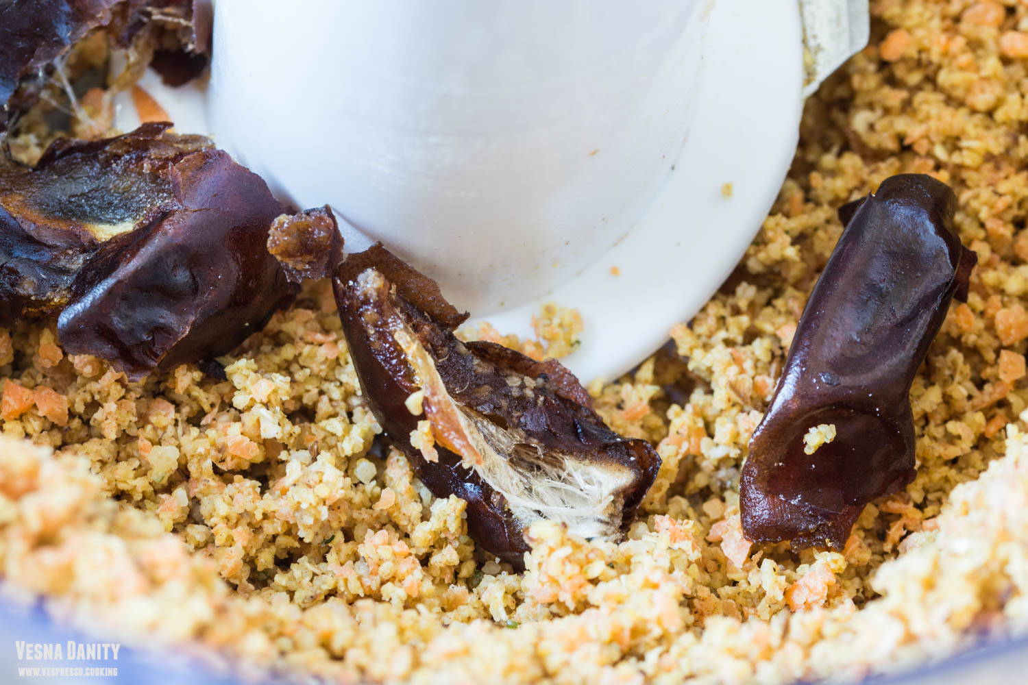- Adaugă curmalele și pulsează până când rezultă un un aluat lipicios. Consistența sa depinde de cantitatea de apă din morcovi și curmale. Dacă amestecul pare lichid, mai adaugă 1 – 2 linguri de fulgi de ovăz. Dacă amestecul e prea sfărâmicios, mai adaugă 1 – 2 curmale.