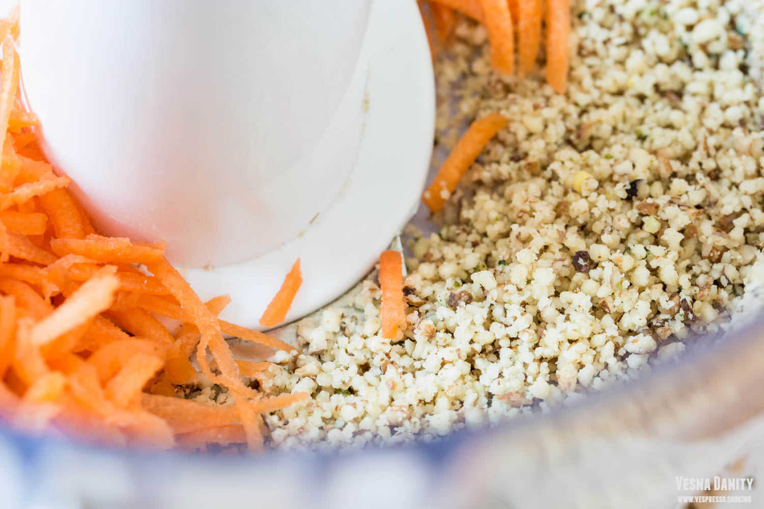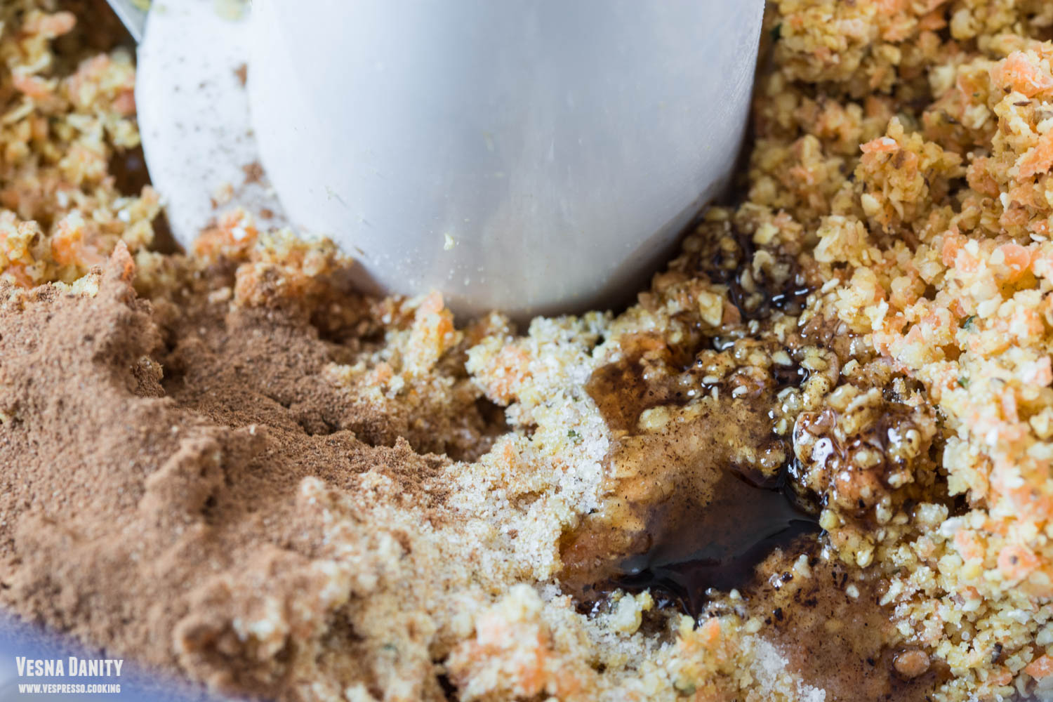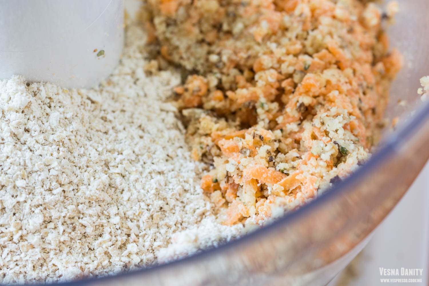 - Scoate făina de ovăz într-un bol și mixează nucile împreună cu semințele de cânepă. Adaugă morcovii rași și continuă să mixezi până când rezultă un amestec sfărâmicios de culoare portocalie.