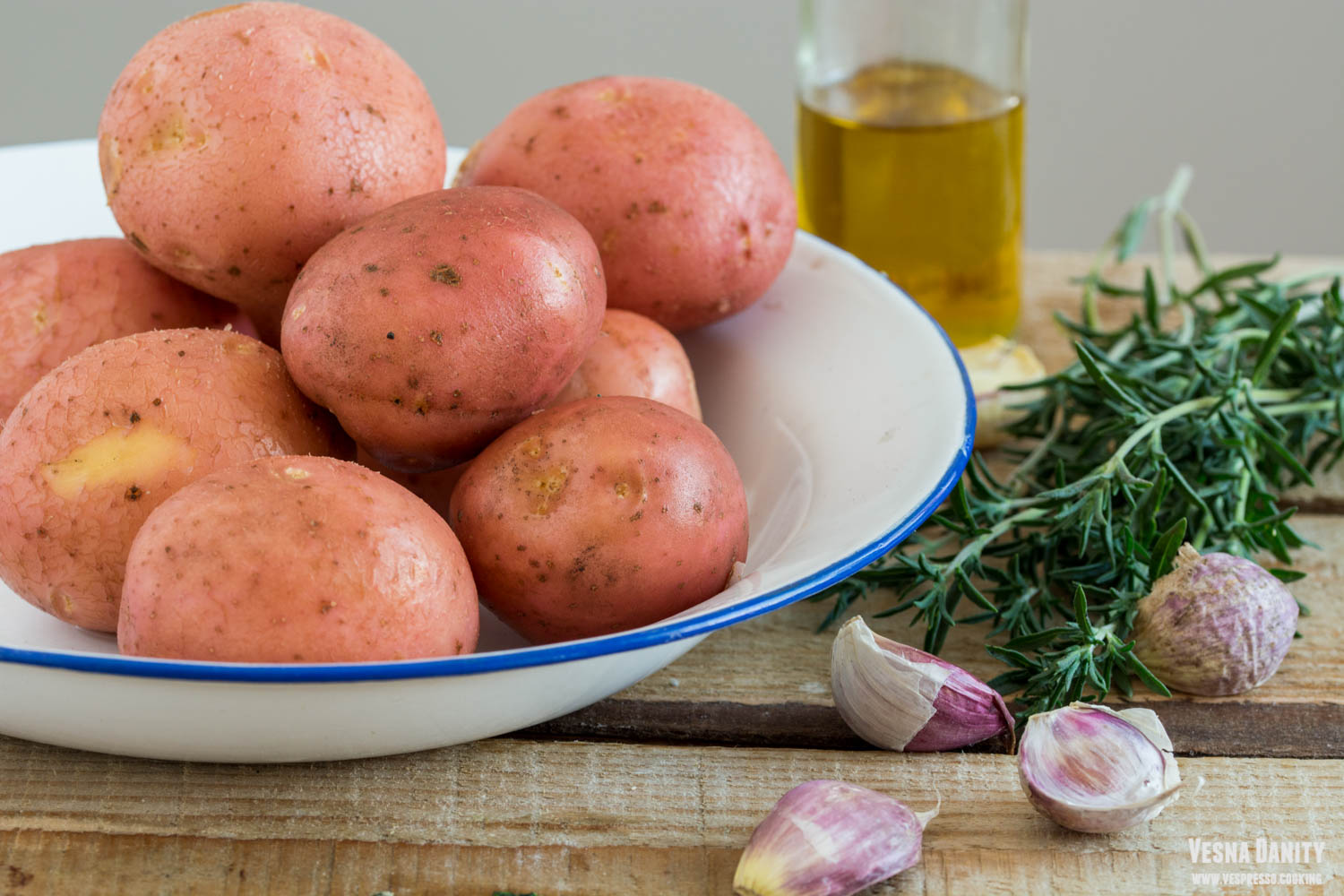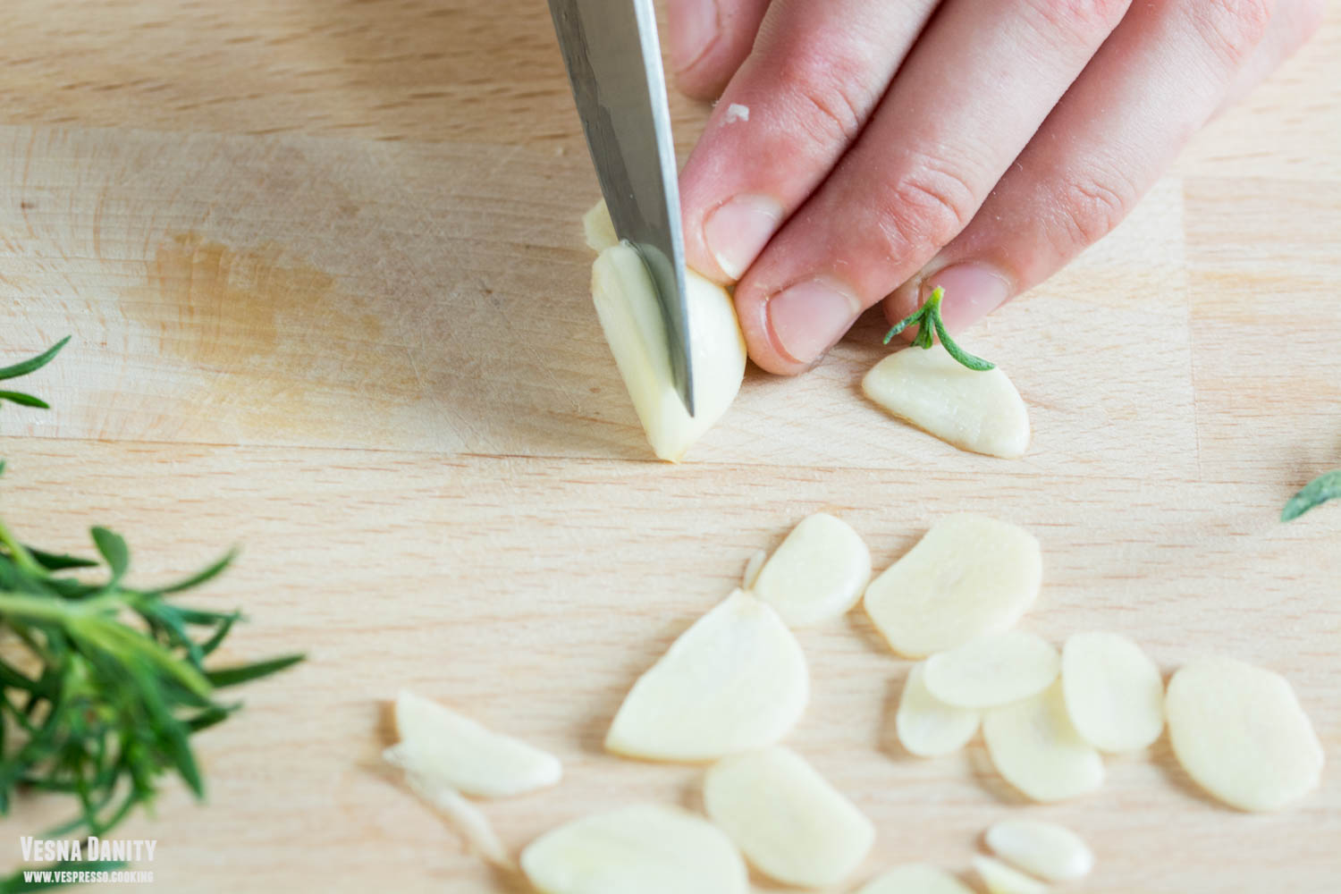 - Am spălat cartofii, i-am șters cu un prosop de hârtie și am feliat usturoiul în felii subțiri.