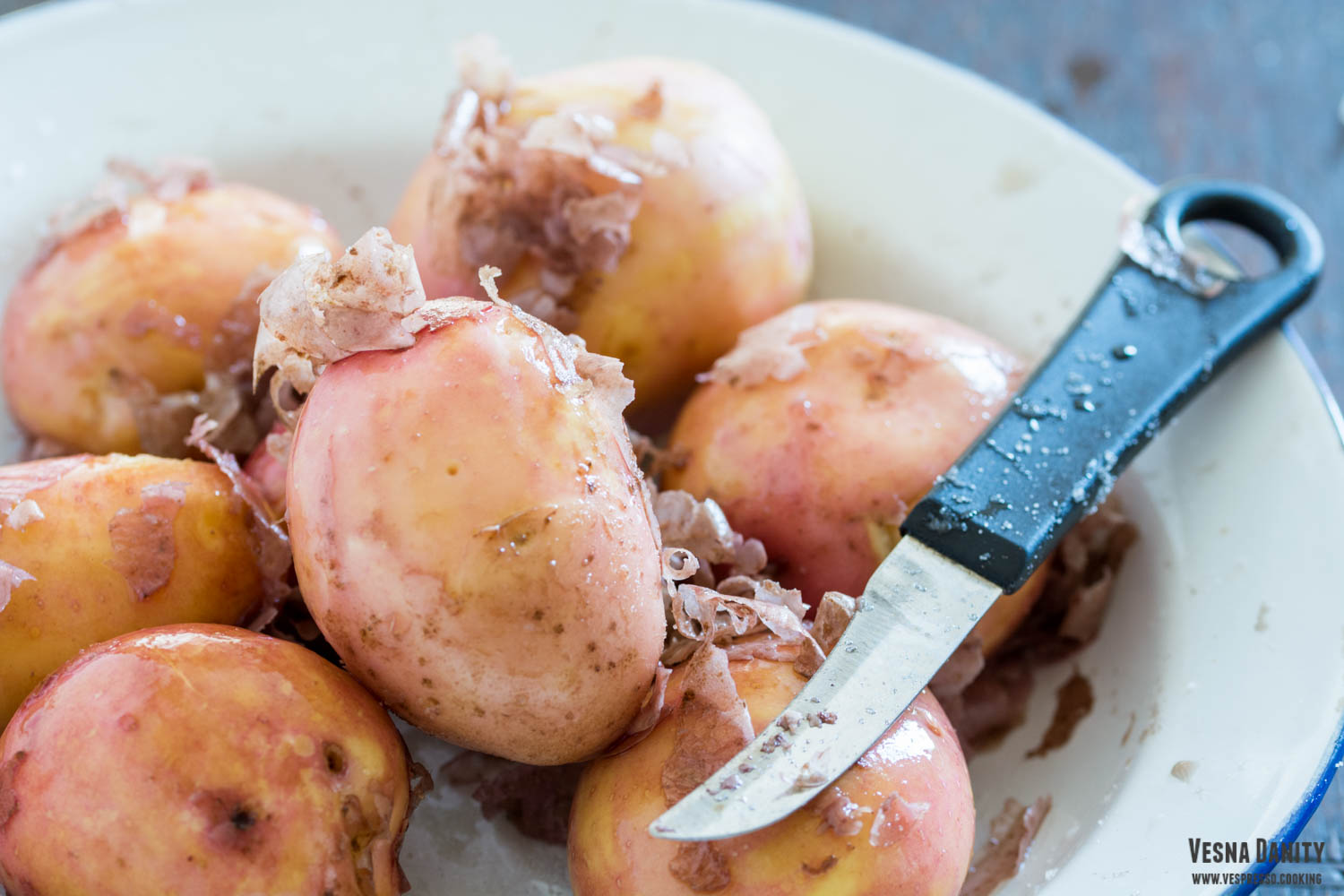 - Am spălat cartofii, i-am pudrat cu ½ lingură de sare grunjoasă și i-am lăsat deoparte pentru 5 minute. După cele 5 minute le-am îndepărtat pielița cu un cuțit de legume (poză), după care i-am spălat din nou și i-am uscat cu un șervet de hârtie.