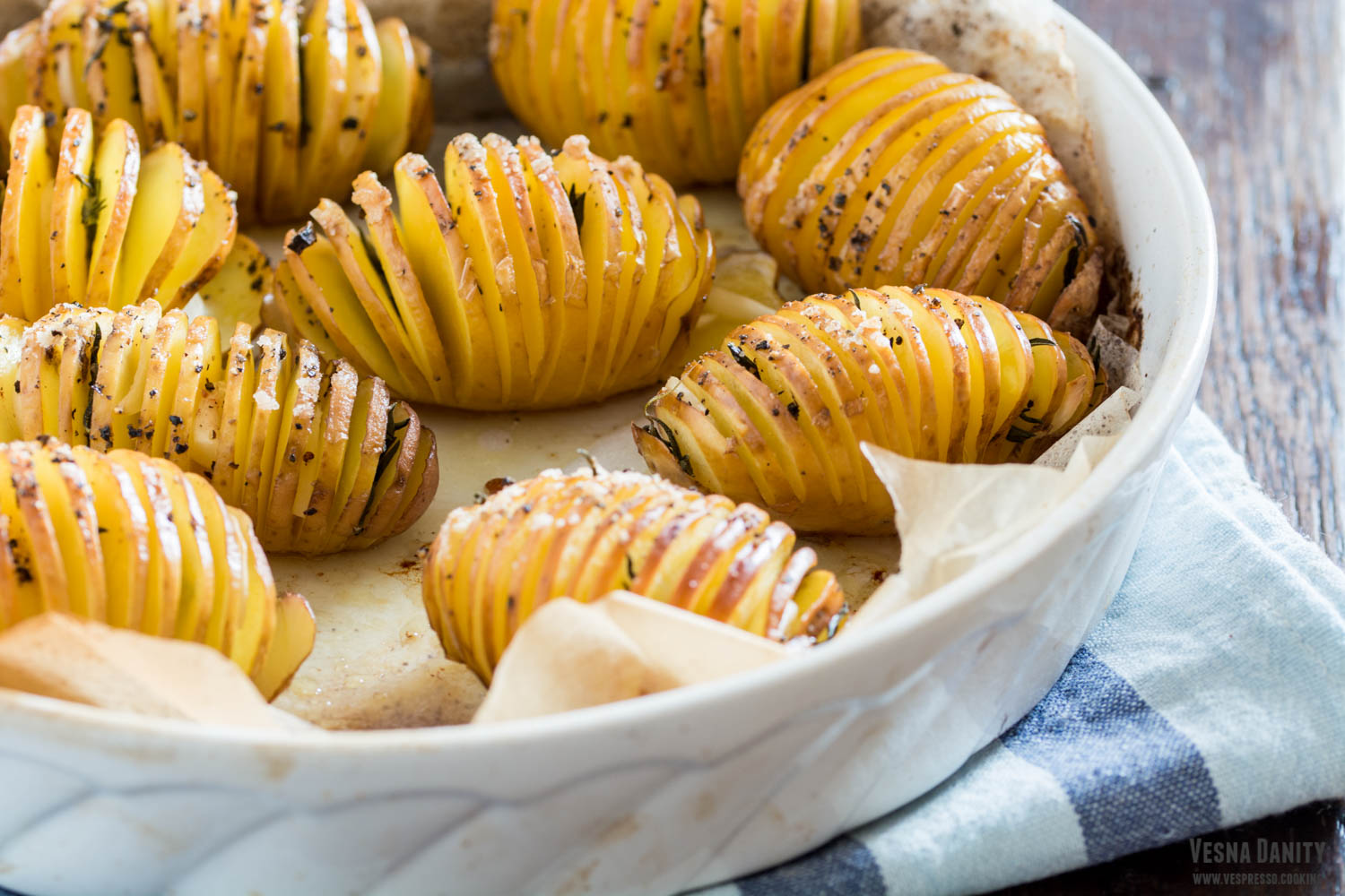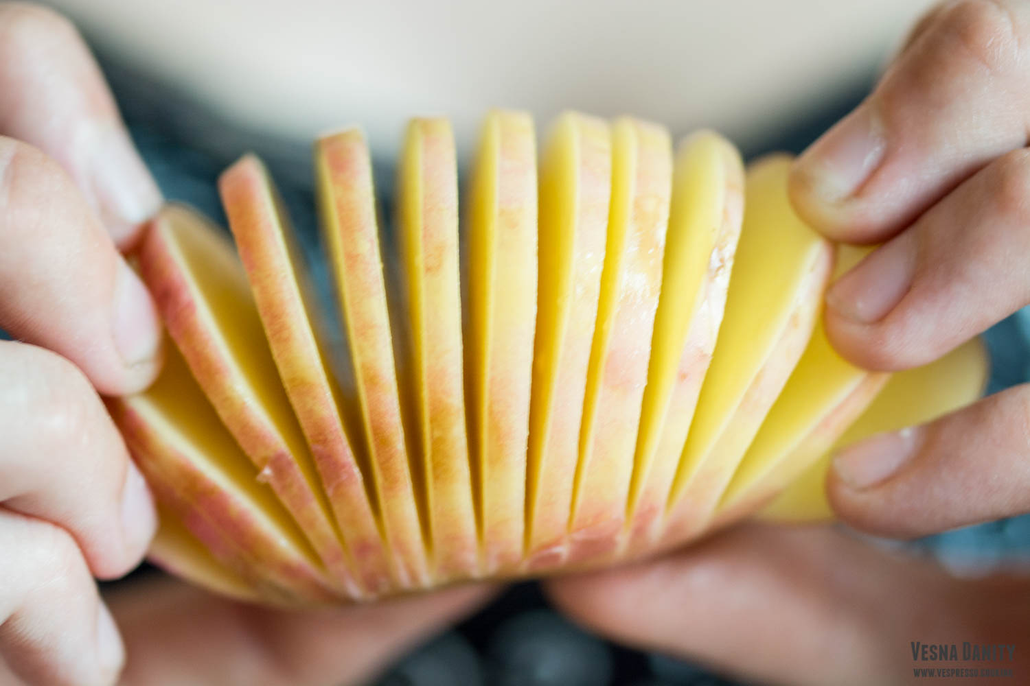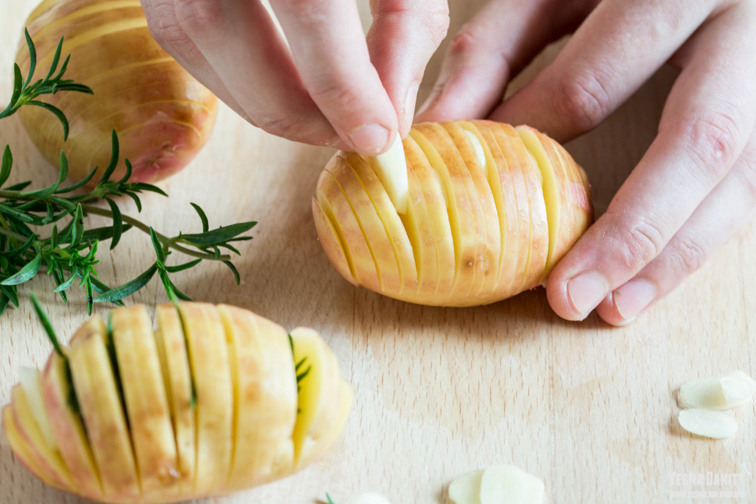 Tehnica lor de pregătire este una foarte simplă, cartofii se crestează în felii paralele, se ung cu unt, după care se rumenesc în cuptor. Pentru a-mi ușura munca, prefer să așez cartoful într-o lingură mare pe care să o sprijin pe o rolă de hârtie (poză). Marginile lingurii îmi vor ghida tăieturile și nu-mi vor permite să secționez cartoful în bucăți. Am vrut ca rețeta să fie una vegană și să o pot consuma și pe perioada postului, așa că am înlocuit untul cu ulei de măsline; pentru a mima gustul complex dat de unt, am împănat cartofii cu felii subțiri de usturoi și frunze de cimbru. Rezultatul a fost unul (muuuuult) mai mult decât satisfăcător!