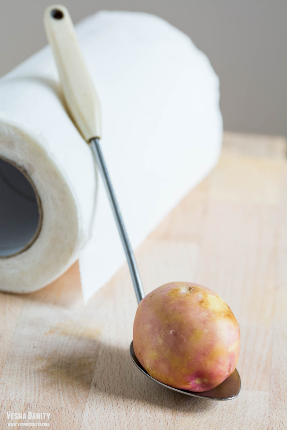 - Am luat un cartof și l-am așezat într-o lingură. Mânerul lingurii l-am rezemat pe un rol de hârtie, pentru a nu-mi aluneca lingura (fundul pe care am așezat lingura este unul antiderapant, dar dacă simți că lingura îți alunecă, ia un șervet de hârtie, umezește-l și așează-l sub lingură).