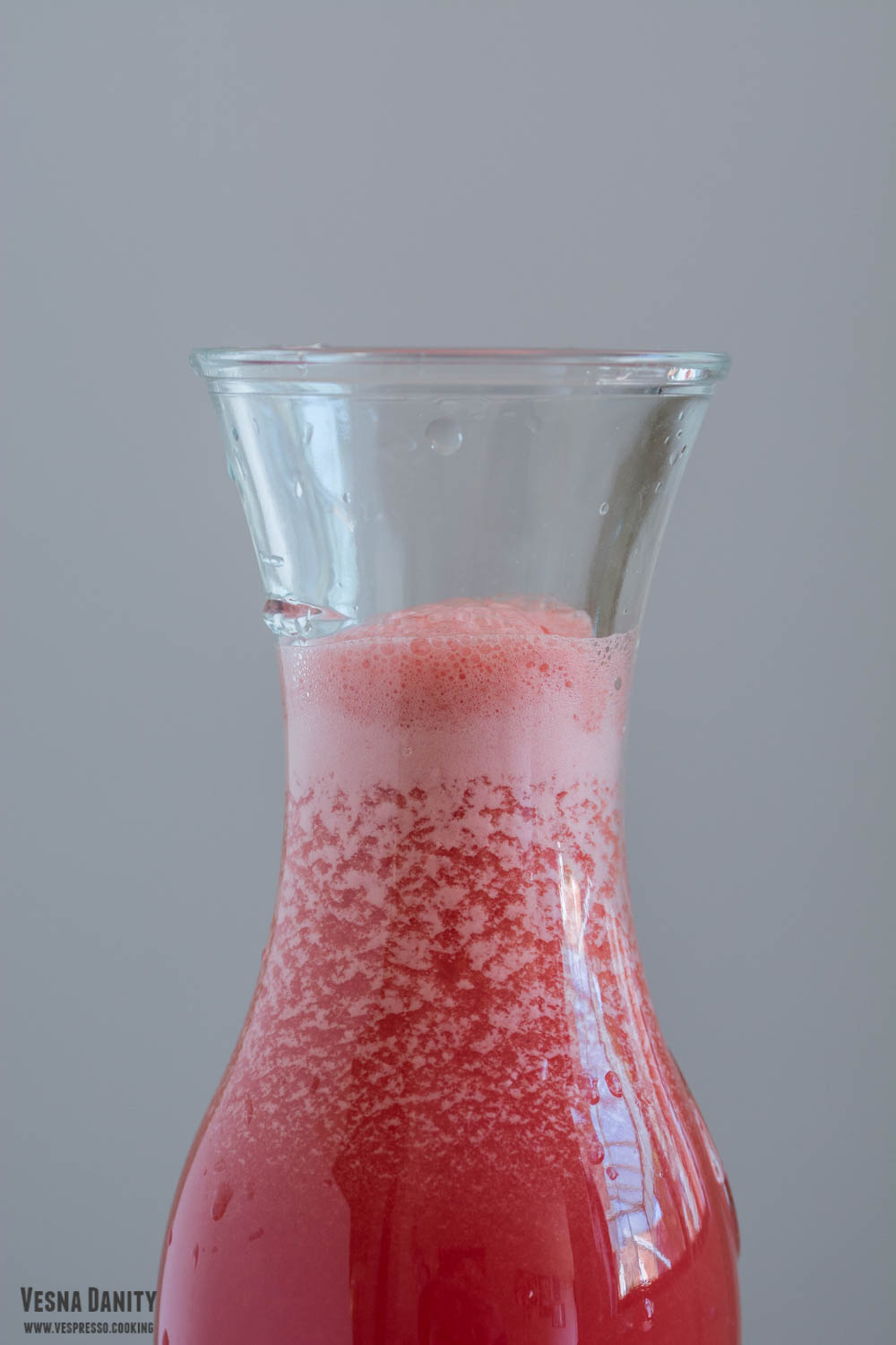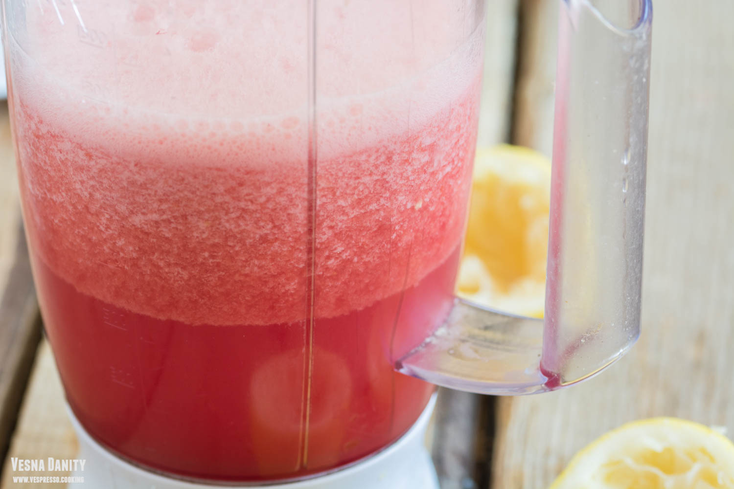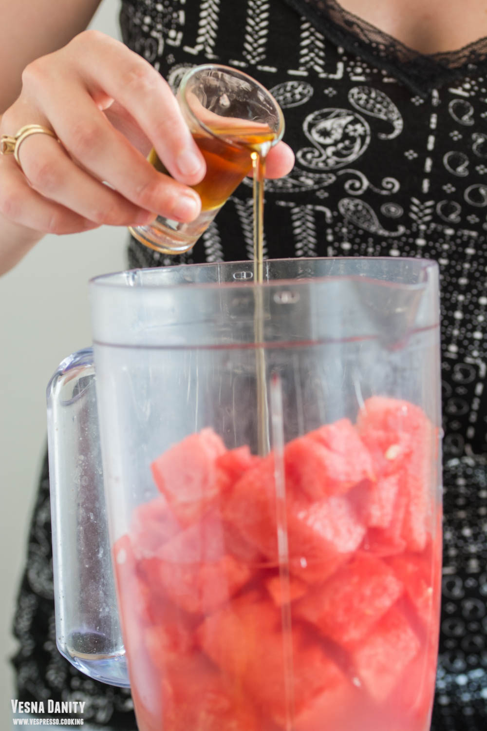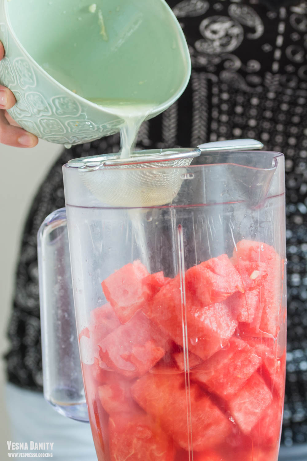 - Mixarea pepenelui. Am așezat cuburile de pepene verde în vasul unui blender, după care am adăugat apa și 1 lingură de sirop de arțar. Am așezat o sită deasupra vasului și am strecurat zeama de lămâie (ca să nu ajungă pulpa și semințele lămâii în blender).