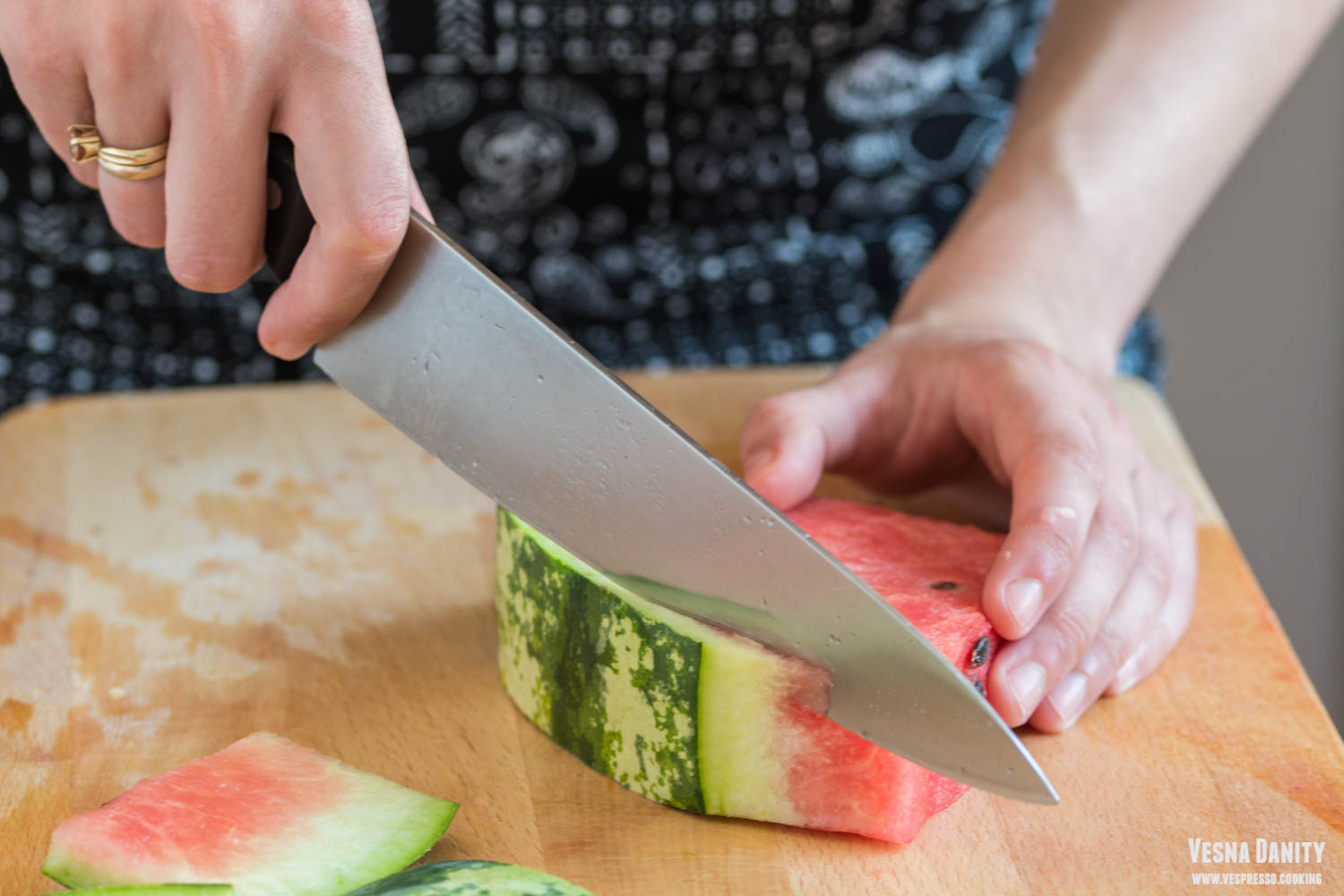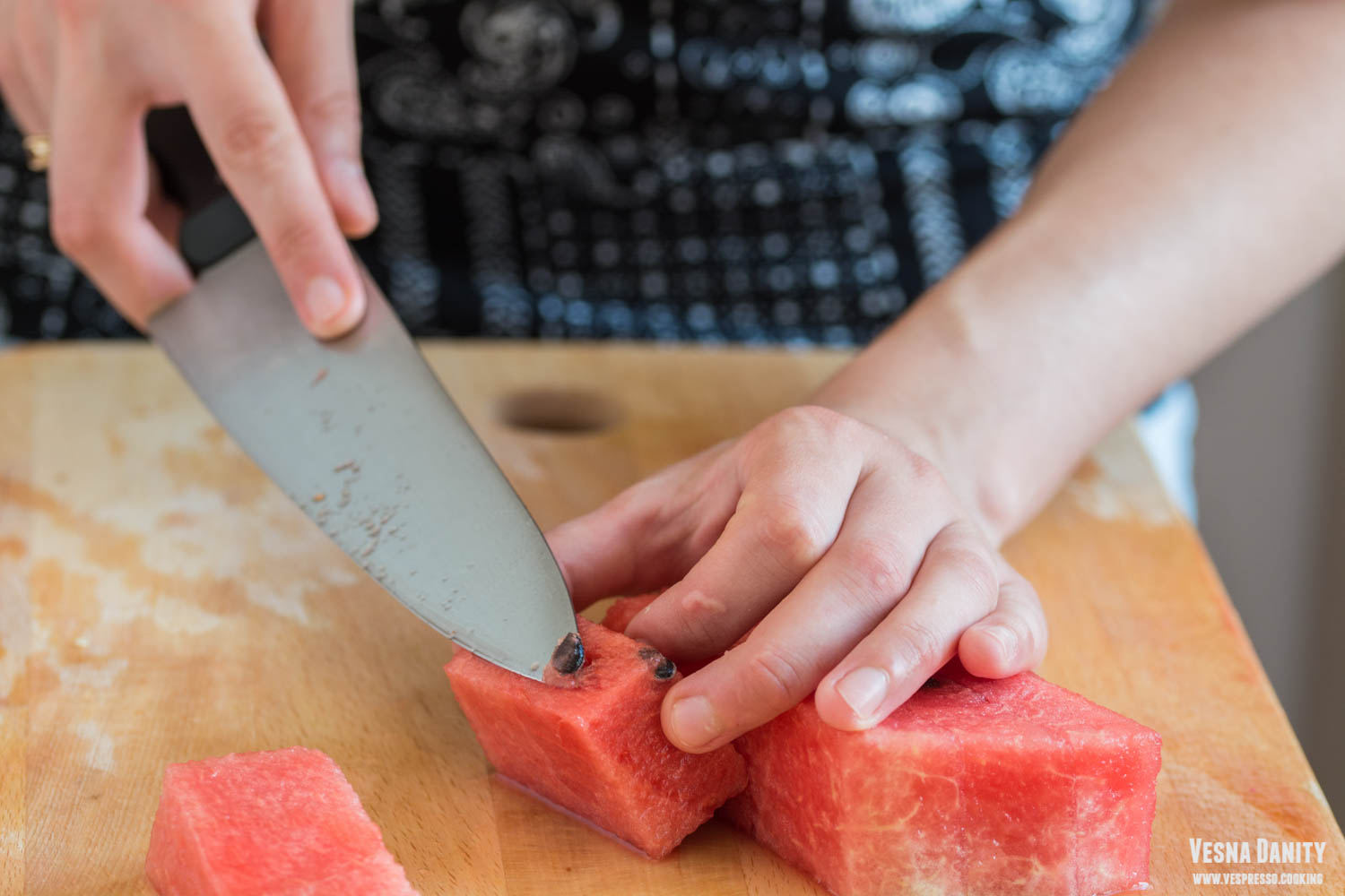 - Pregătirea pepenelui. Am luat bucata de pepene verde și i-am îndepărtat coaja, după care am tăiat-o în cuburi.