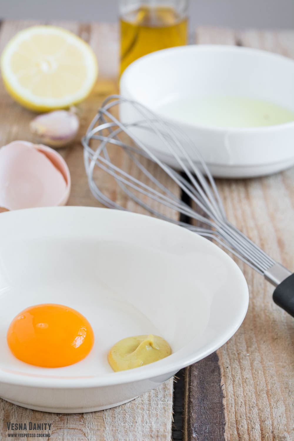 2. Intre timp am preparat sosul. Într-un bol am amestecat gălbenușul cu muștarul, prin mișcări circulare și într-un singur sens, folosindu-mă de un tel.