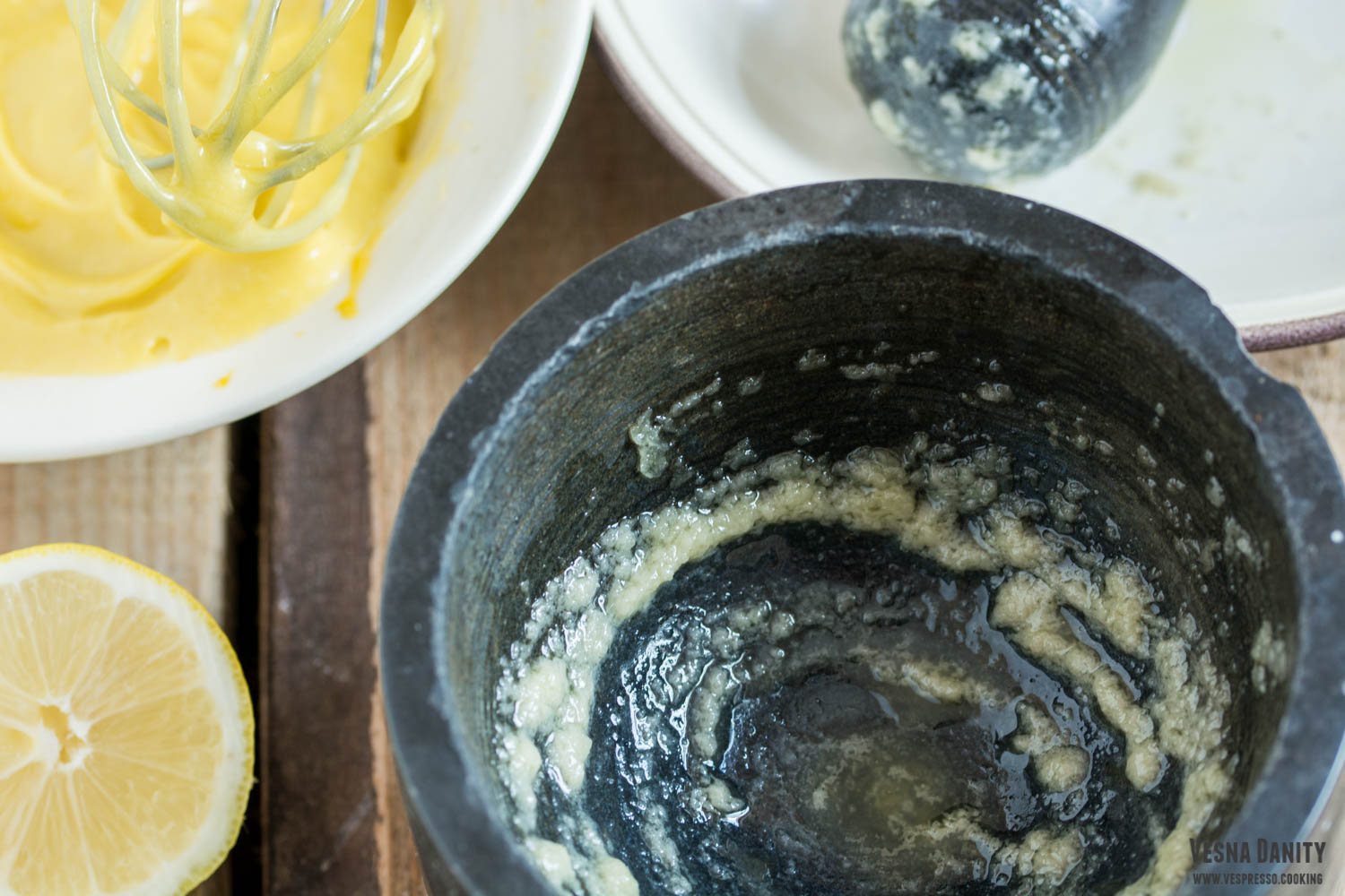 Pentru această rețetă folosesc jumătate (2 – 3 linguri) din cantitatea de sos aïoli care rezultă din ingredintele enumerate mai sus.