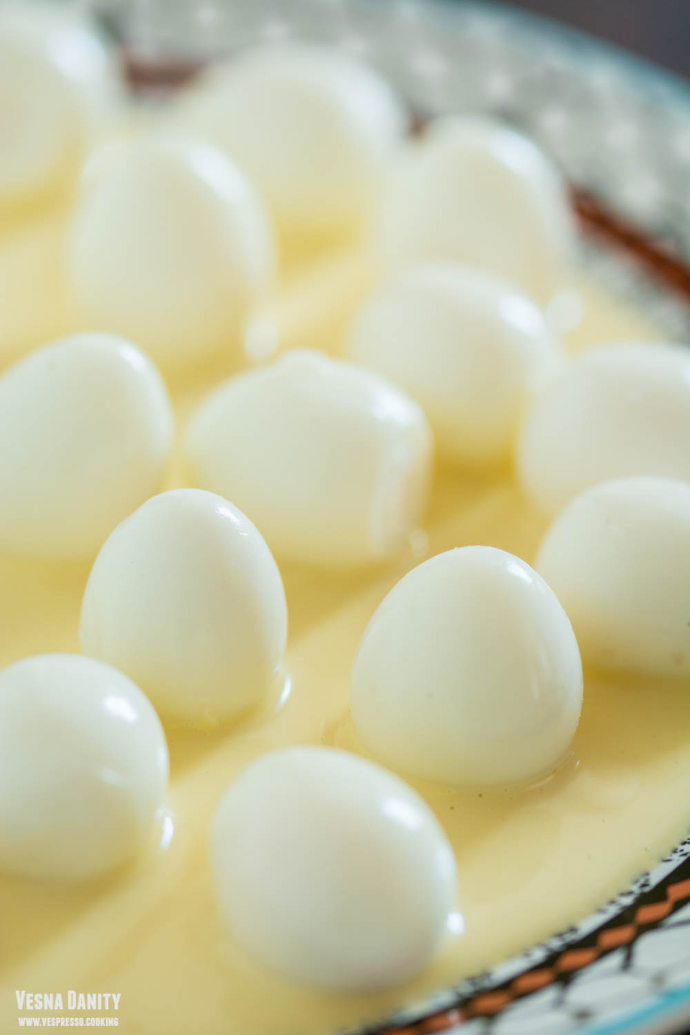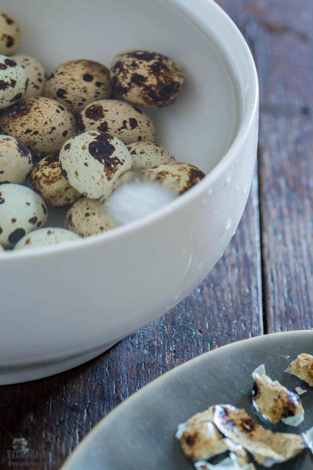 1. Am spălat ouăle de prepeliță, le-am așezat într-o oală și le-am acoperit cu apă rece. Am pus oala pe aragaz la foc mediu-mare și am așteptat să dea în clocot. Când a început să fiarbă, am redus focul la minimum și am fiert ouăle timp de 3 minute. Le-am scos într-un bol cu apă rece, le-am lăsat să se răcească timp de vreo 5 minute, după care le-am decojit.