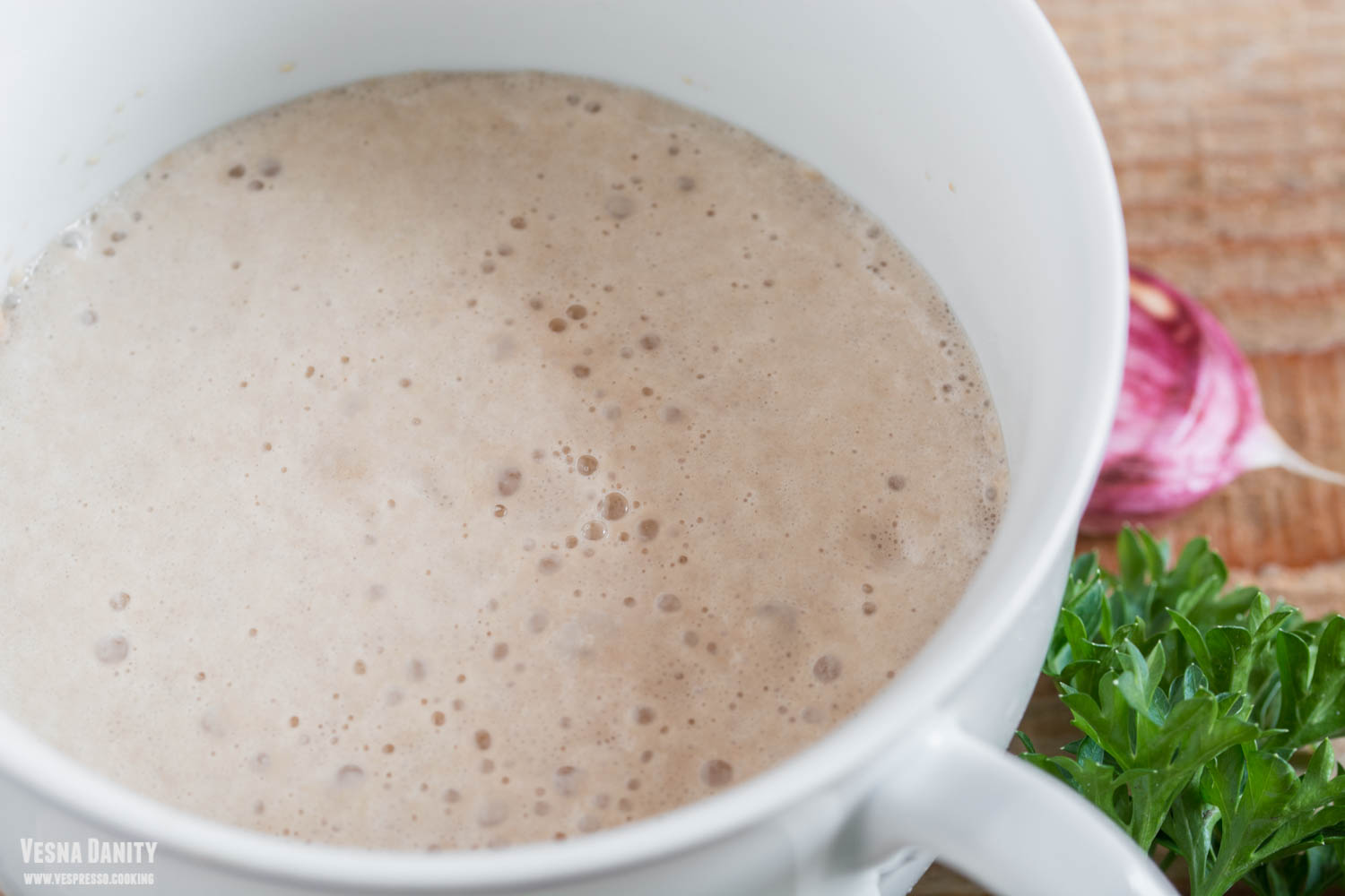 - Într-un bol am amestecat apa, drojdia și zahărul și am lăsat bolul deoparte pentru vreo 10 minute. După cele 10 minute, drojdia se activase și amestecul era spumos la suprafață.