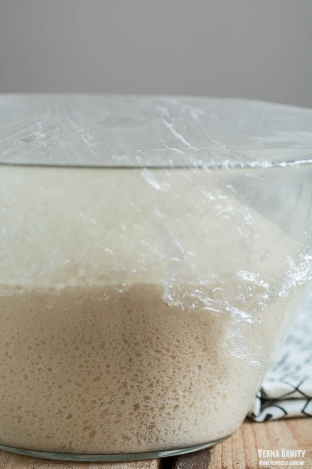- L-am pus înapoi în bol, l-am așezat într-un loc cald, l-am acoperit cu un prosop și l-am lăsat să dospească până când și-a dublat volumul (vreo 50 de minute).