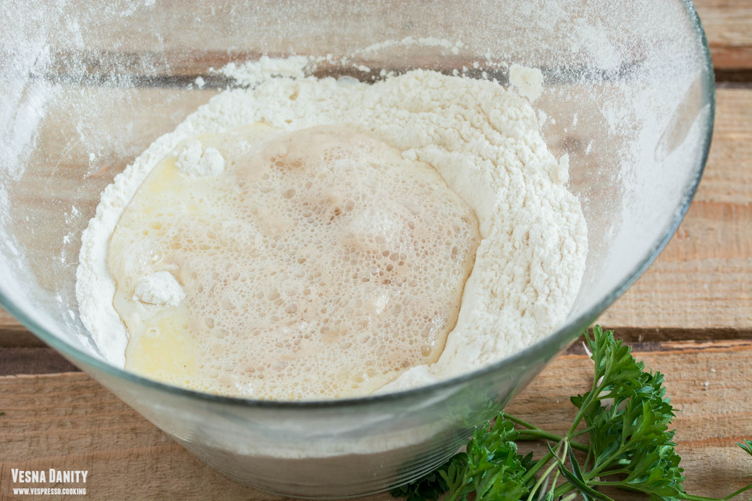 - Într-un bol încăpător am cernut făina și am amestecat-o cu sarea. Am făcut o adâncitură în mijlocul ei și am turnat amestecul de drojdie și laptele. Am amestecat cu o lingură de lemn până am format o minge de aluat.
