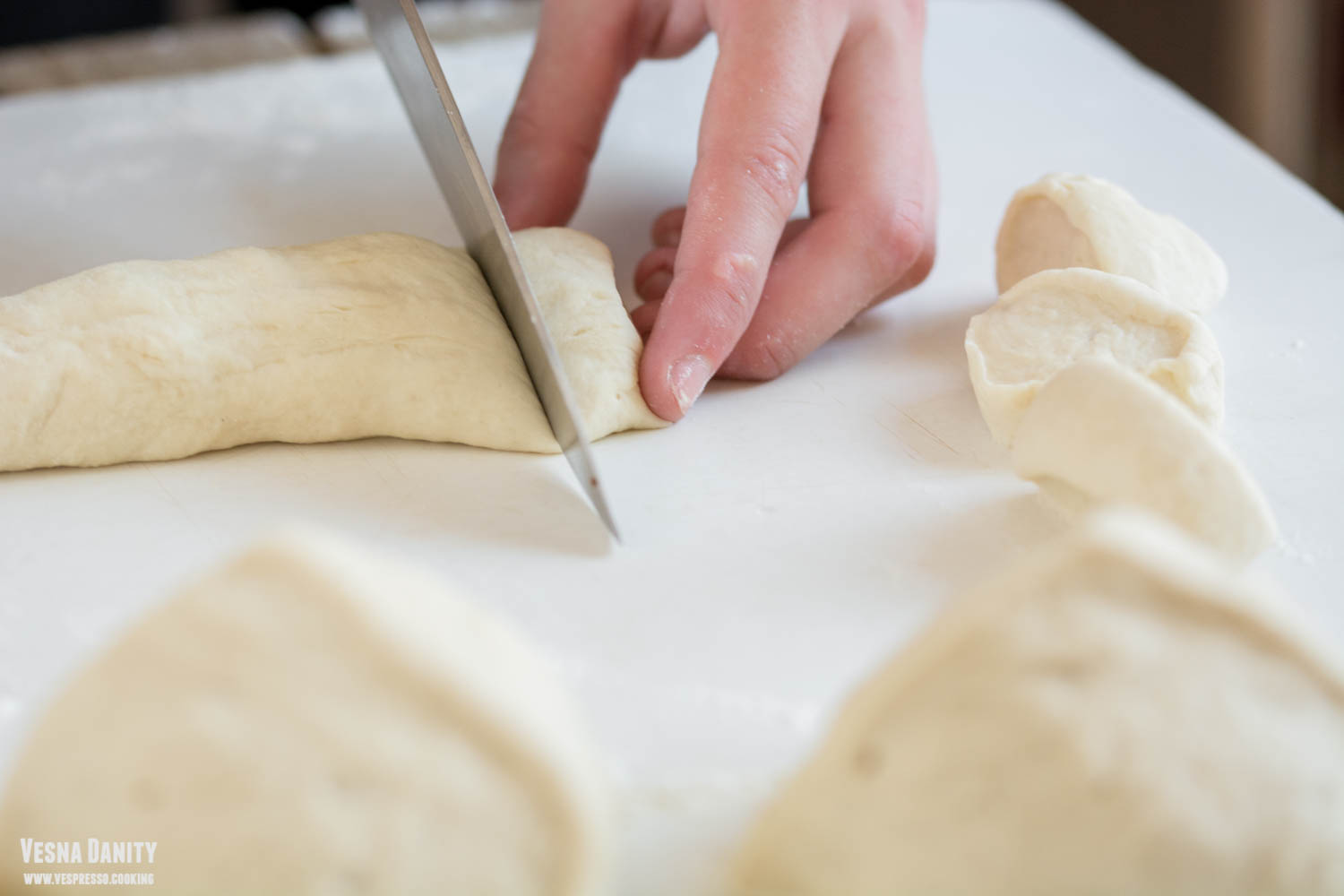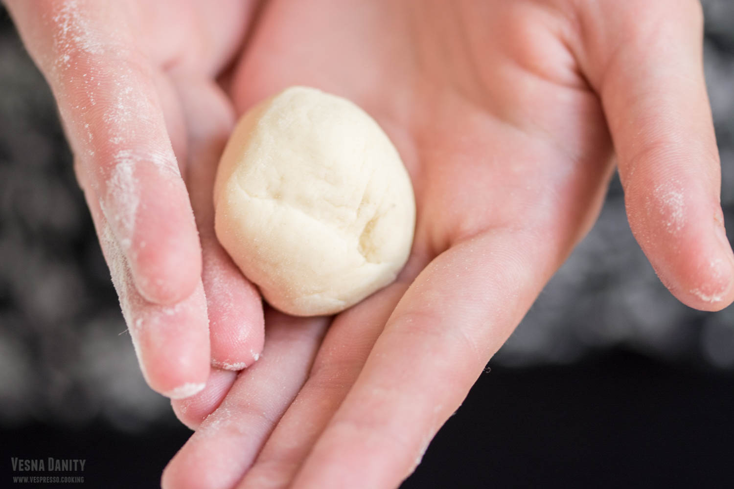 - L-am împărțit în 4 și am alungit cu palmele fiecare bucată, pentru a forma un baton. Am împărțit fiecare baton în 12 bucăți (poză). Am luat fiecare bucată și i-am dat o formă circulară cu ajutorul palmelor (poză).