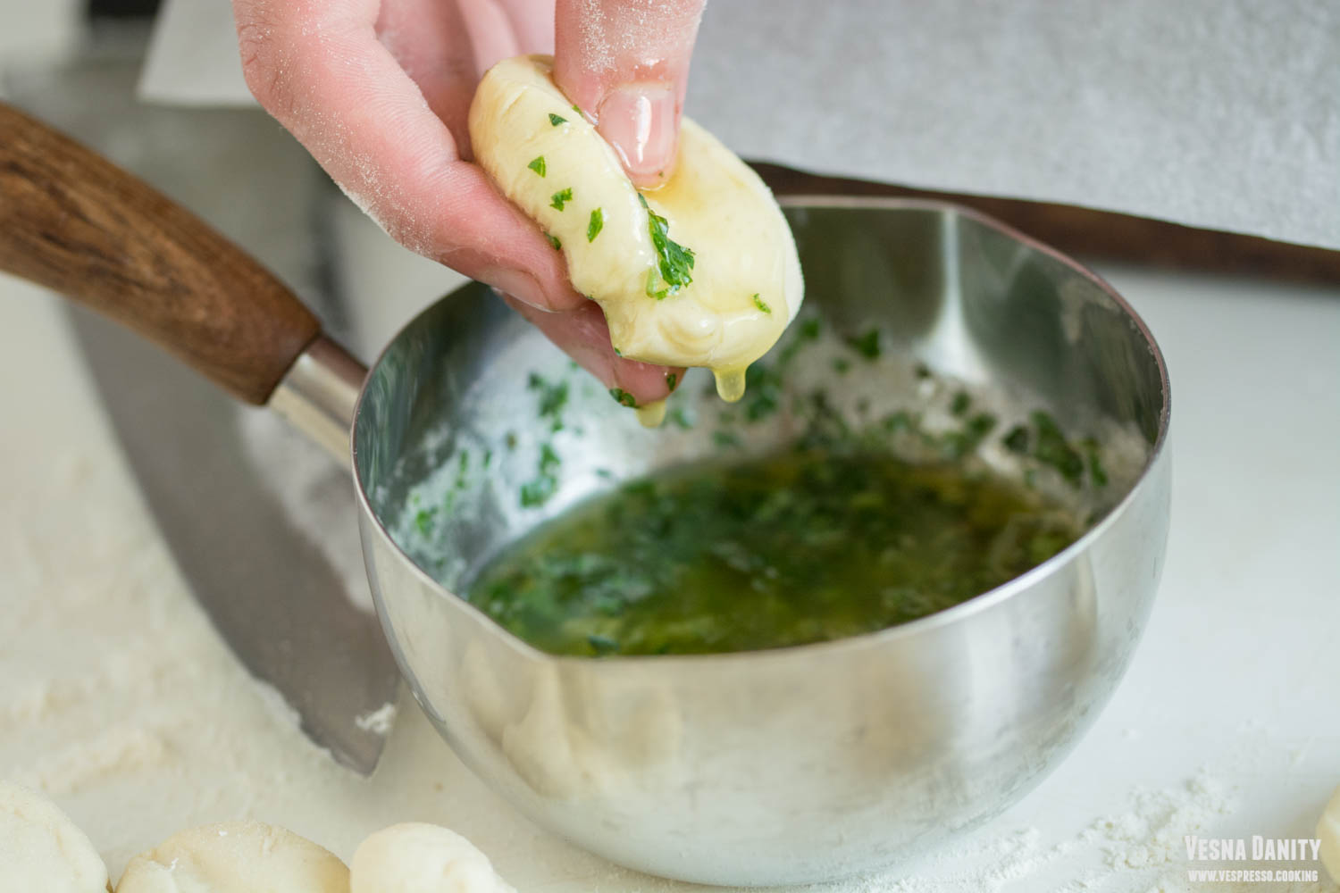 - Am luat fiecare bucată de aluat și am trecut-o prin amestecul de unt, având grijă să scutur excesul.