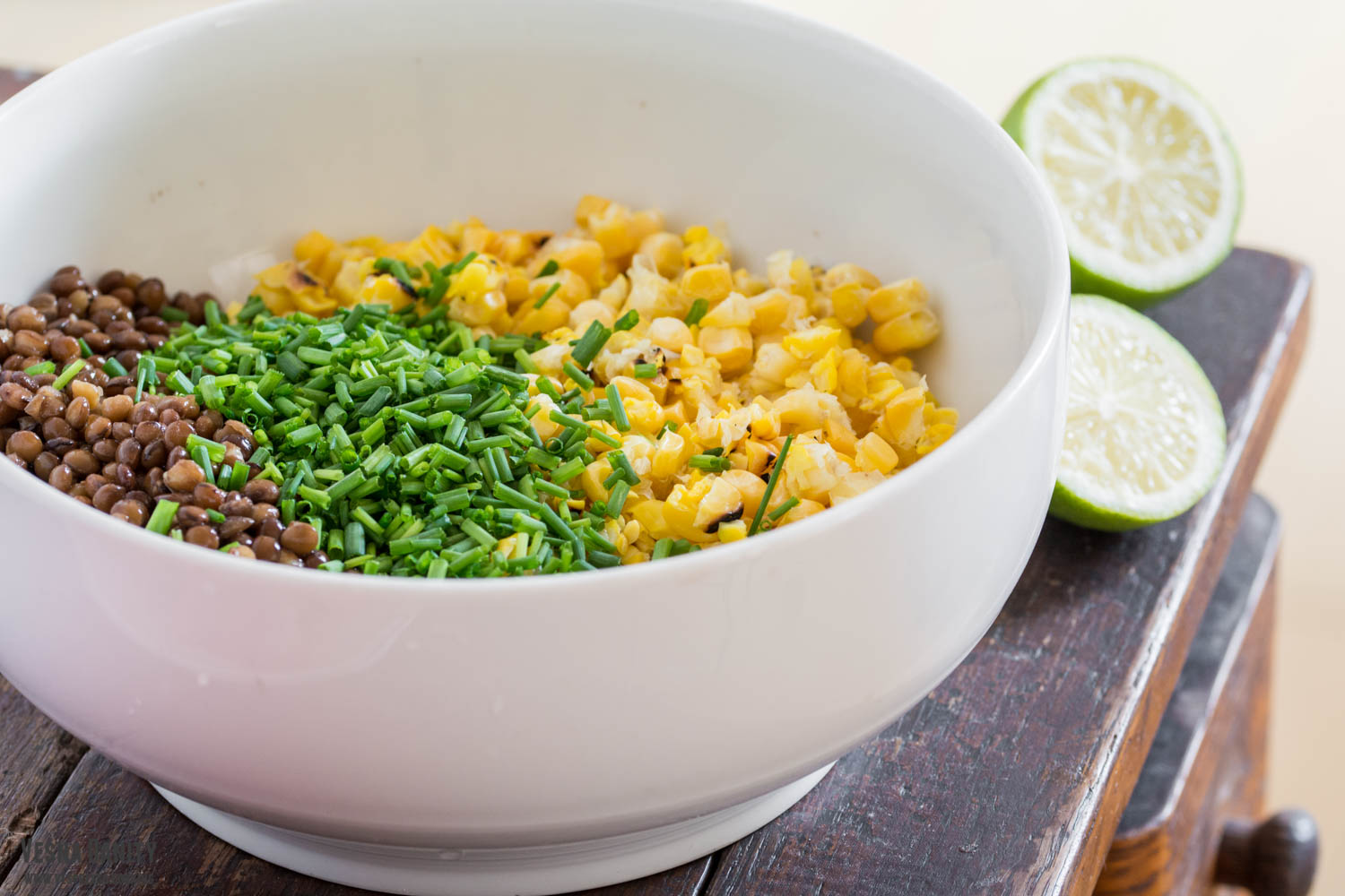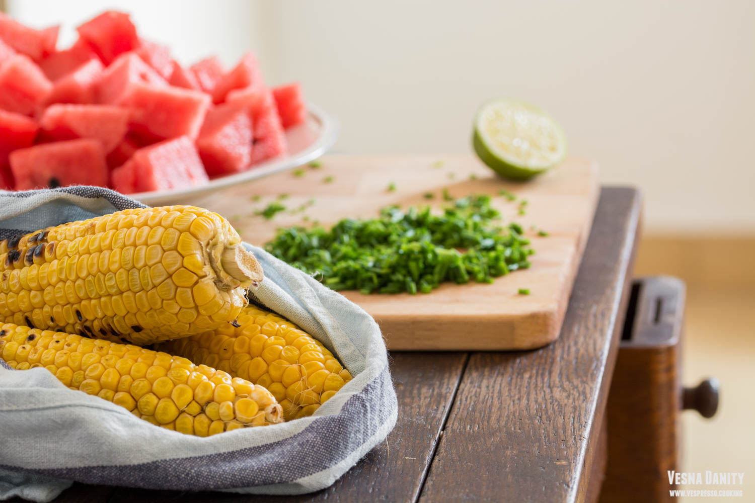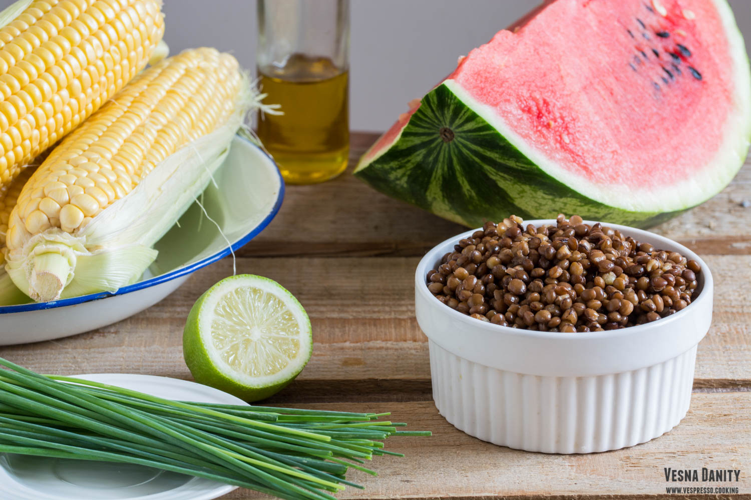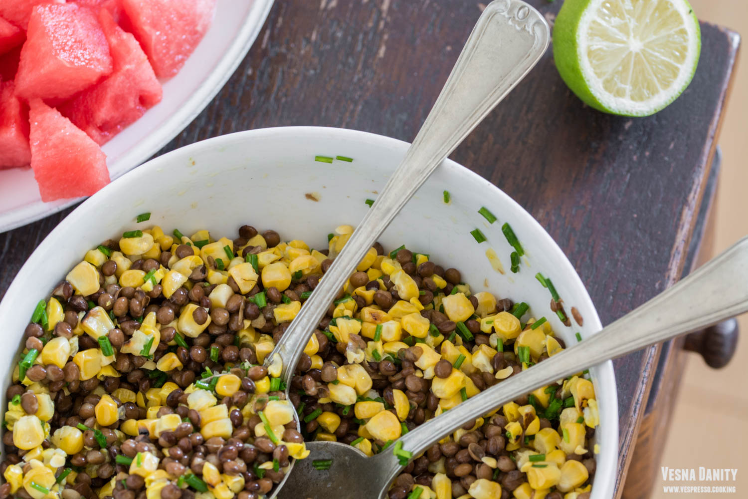 Rar mi-a fost dat să mă intersectez cu o salată atât de interesantă. E o salată aparte, atât prin combinații de gusturi, cât și prin asocieri de culori și texturi. E o salată simplă în aparență, preparată din 5 ingrediente, toate necostisitoare și toate de sezon. Porumbul copt, dulce și aromat, pepene verde zemos și parfumat, linte consistentă și aproape cremoasă. Trei ingrediente cu personalitate, a căror arome parcă se amplifică sub ploaia de chives tocat și zeamă de lime.
