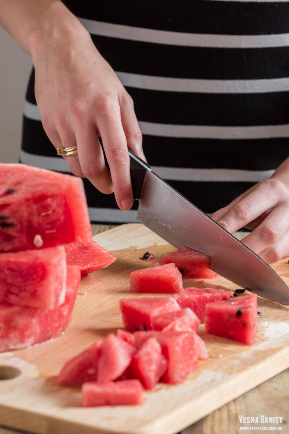 - În timp ce porumbul se rumenea pe grătar, m-am ocupat de pepene. Am tăiat felia în felii mai mici, le-am îndepărtat coaja, după care le-am tăiat în cubulețe. Fiecare cubuleț l-am tăiat în 2 triunghiuri și am îndepărtat sâmburii cu ajutorul unui cuțit (poză).