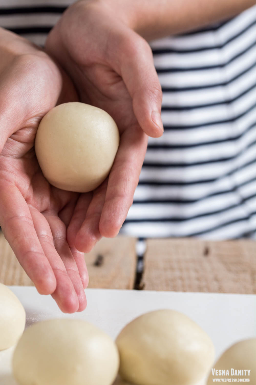 3. Am pudrat cu făină blatul de lucru și am frământat aluatul timp de vreo 3 minute, până când a devenit neted la suprafață (poză). L-am învelit lejer într-o bucată de folie de prospețime și l-am lăsat la odihnit pentru 15 minute.