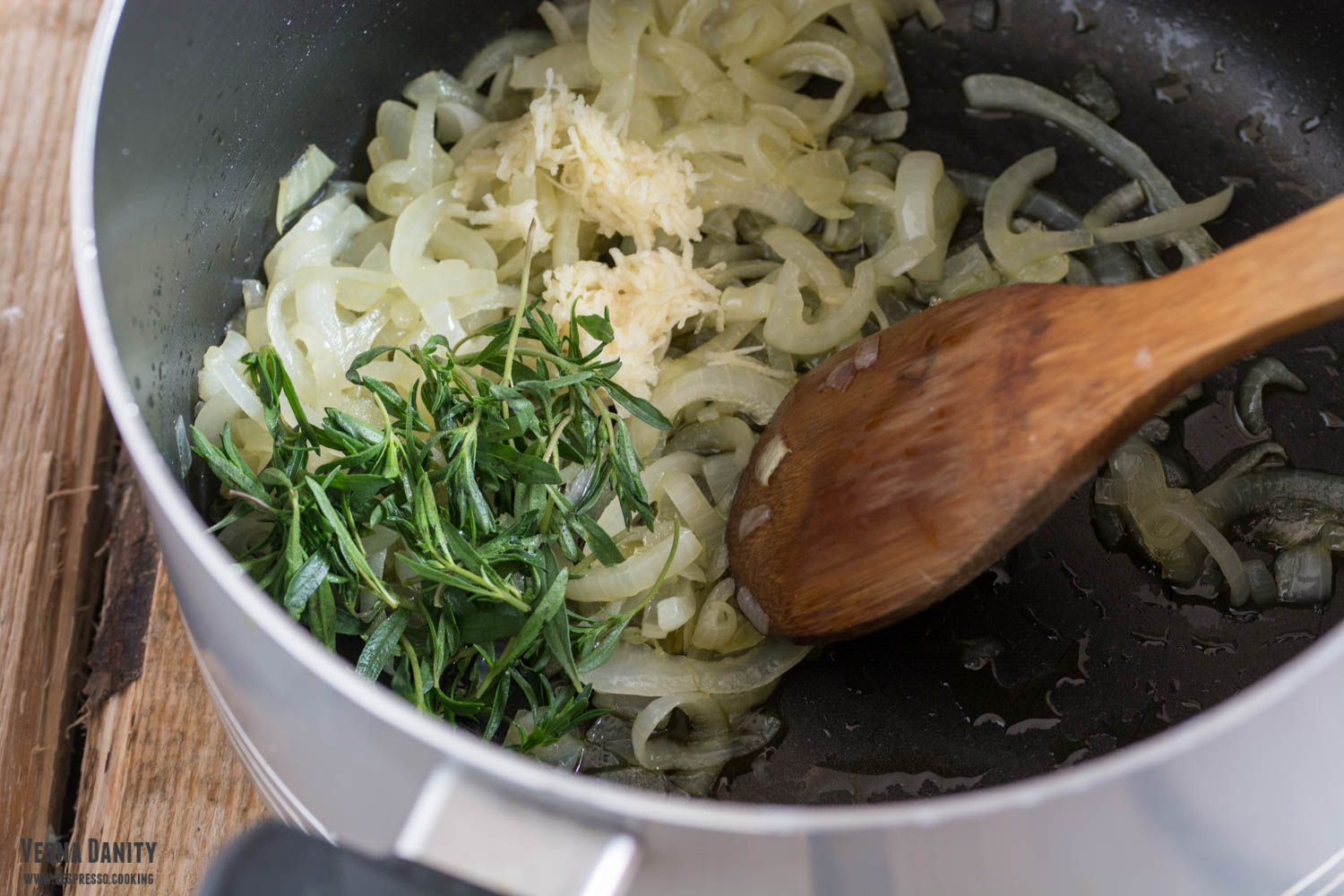 - Sotarea legumelor. Am încins 3 lingură de ulei într-o oală de dimensiune medie. Am adăugat ceapa și am sotat-o vreo 3 minute, până când a devenit translucidă. Am adăugat usturoiul și l-am sotat și pe el până când a devenit parfumat (aproximativ 1 minut). Am adăugat condimentele și am amestecat.