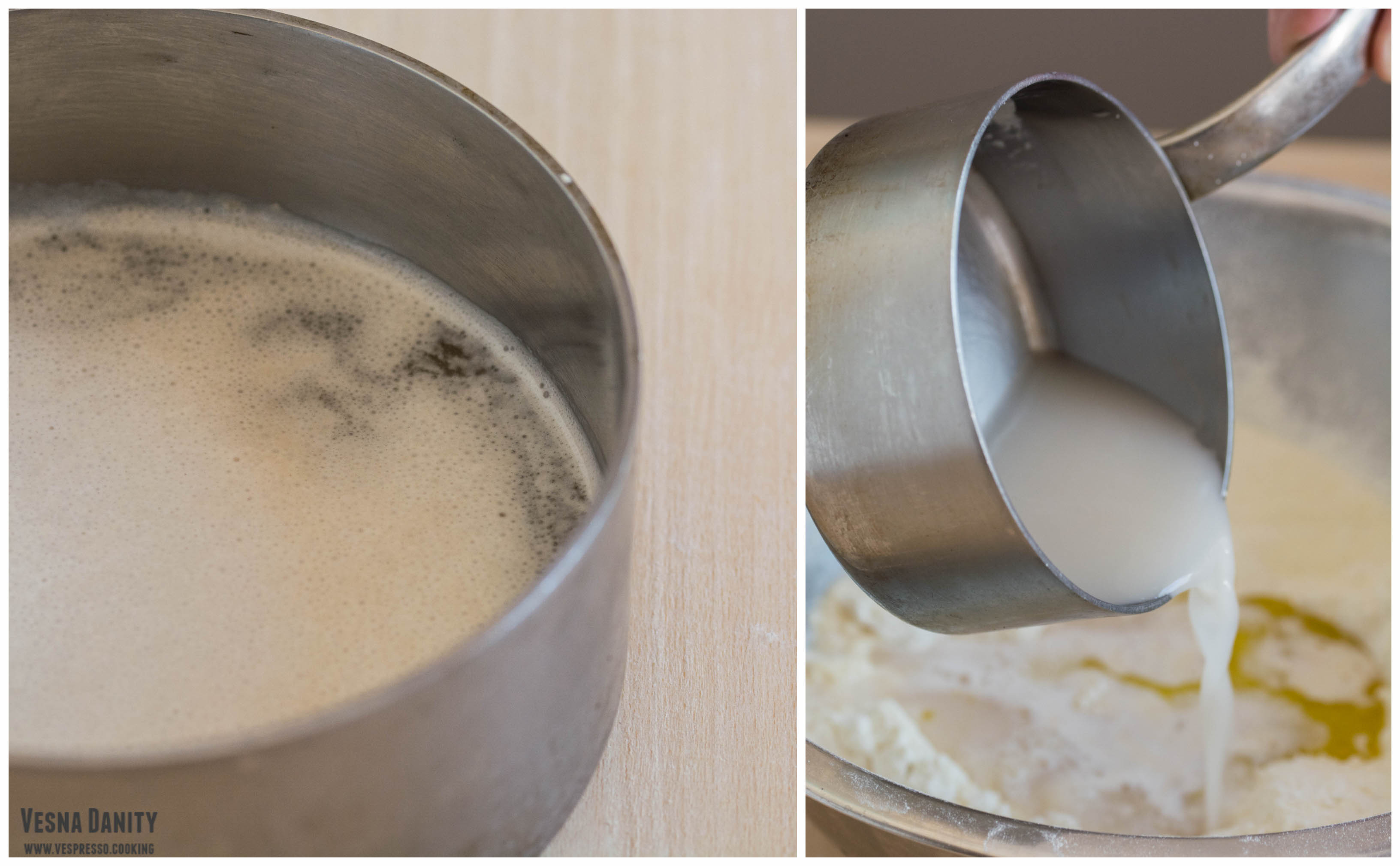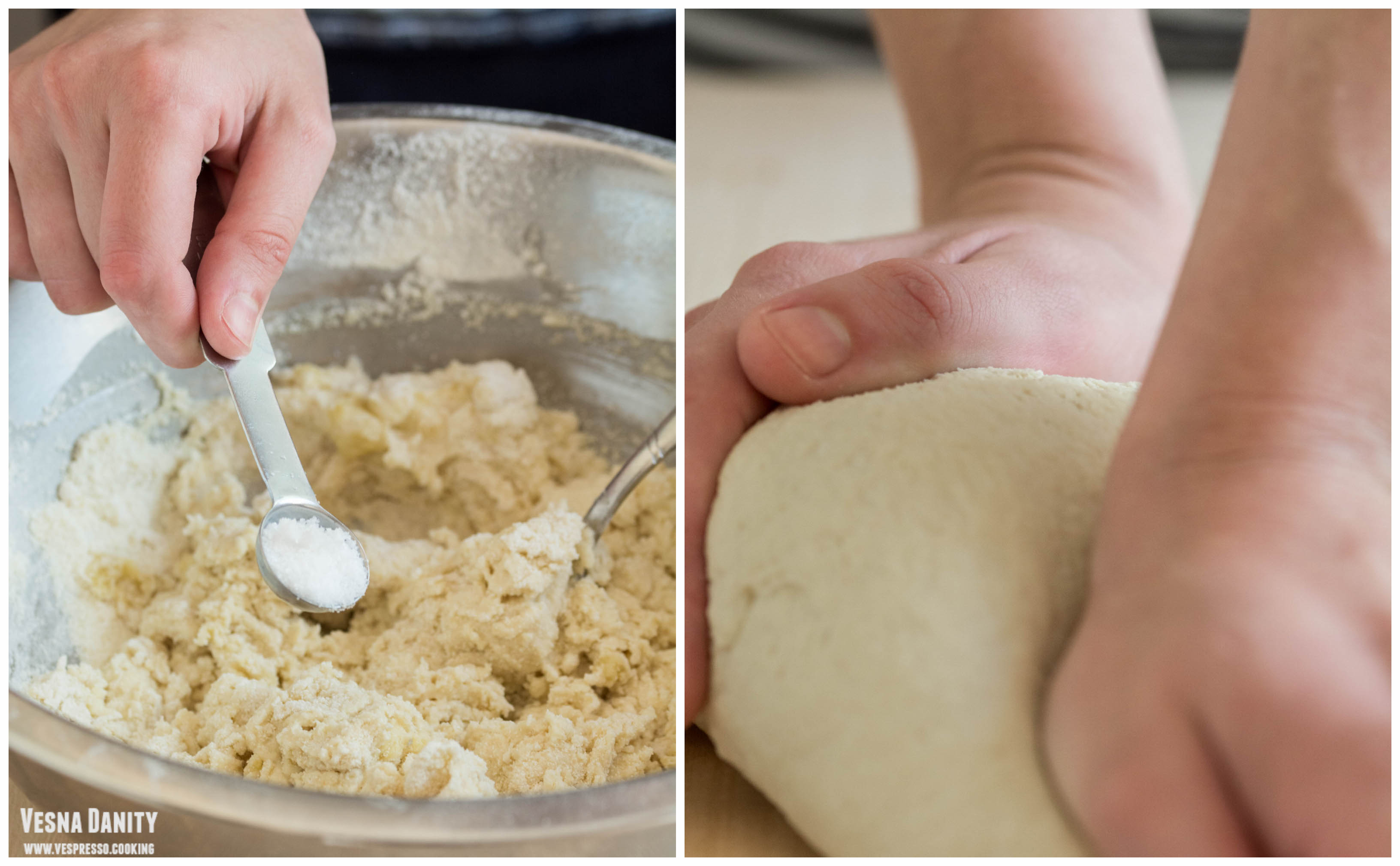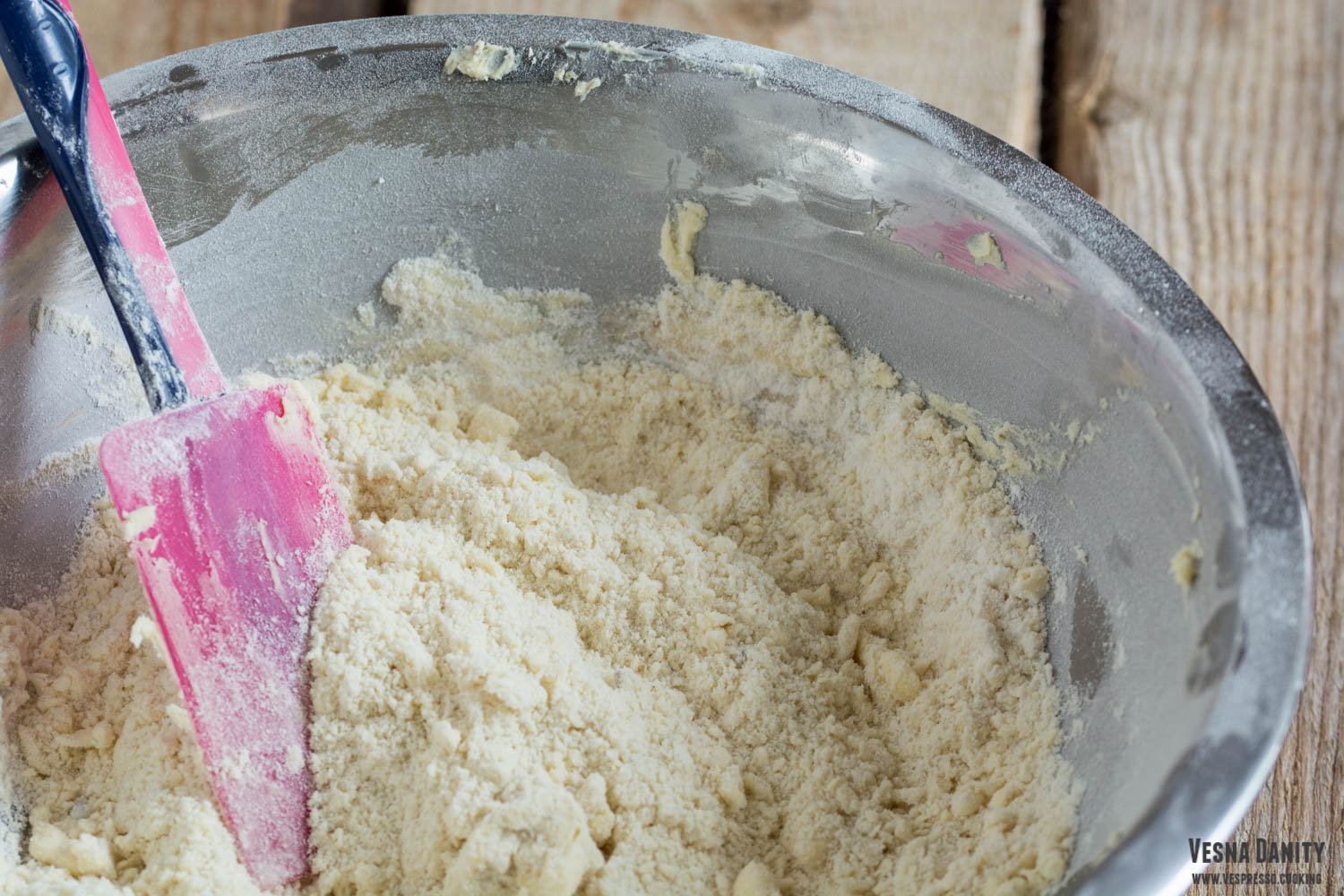 - Pregătirea ingredientelor uscate. Întru-un bol încăpător am cernut făina. Am adăugat jumătate din cantitatea de sare (adica un sfert de linguriță), bicarbonatul de sodiu, praful de copt , zahărul și scorțișoara și am amestecat.