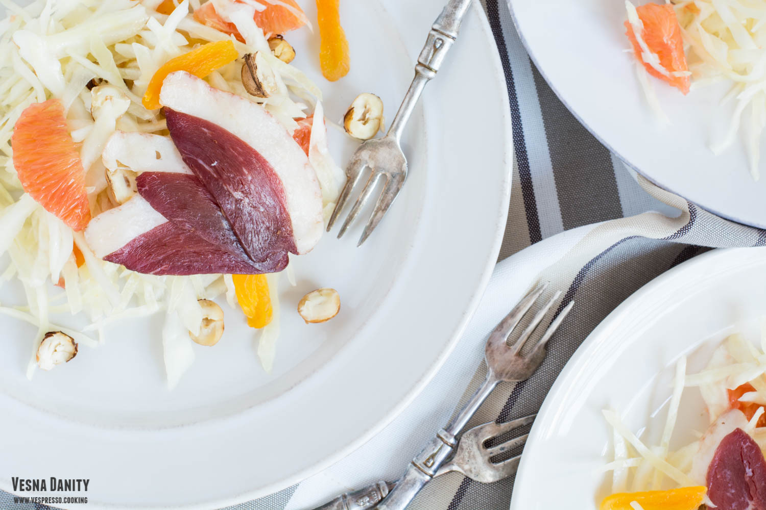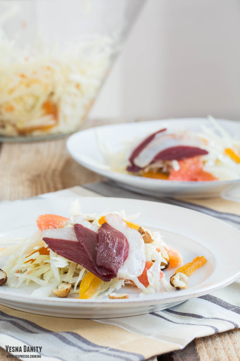 5. Dressing și asamblare. Pentru a forma dressingul, am luat un bol și am amestecat oțetul cu uleiul și siropul de arțar. Am adăugat sucul și coaja citricelor și am amestecat. Am adăugat ceapa, ardeiul și rucola și am amestecat. În final am adăugat quinoa și am presărat mugurii de pin.