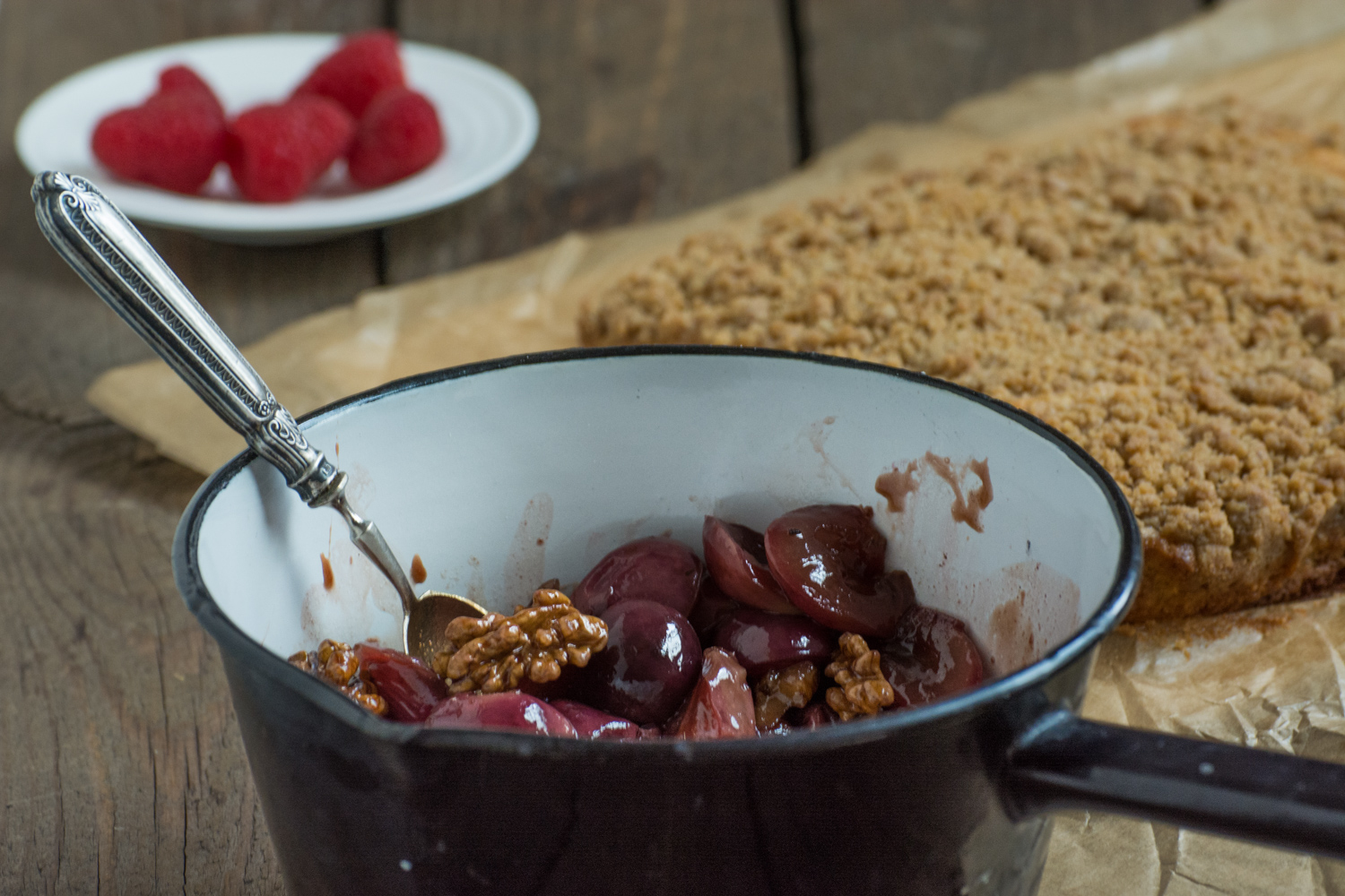 - Coacere. Am turnat amestecul în tavă și l-am copt timp de 10 minute în cuptorul preîncălzit. După 10 minute am scăzut temperatura la 180°C / 350° F (treapta 4) și am mai copt blatul pentru 30 – 35 de minute (până când a trecut testul scobitorii).