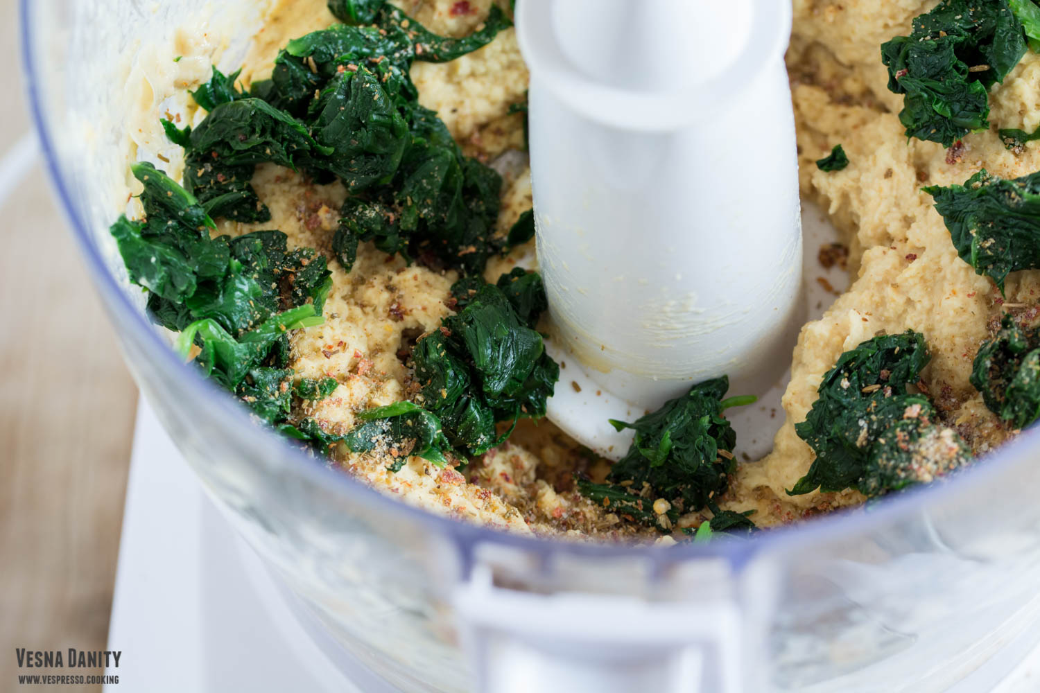 6. Am adăugat leurda blanșată (și mărunțită) și condimentele (chimion, fulgi de chili și sare) pe care le-am sfărâmat într-un mojar în prealabil. Am mixat hummusul, adăugând apă până când am ajuns la consistența dorită.