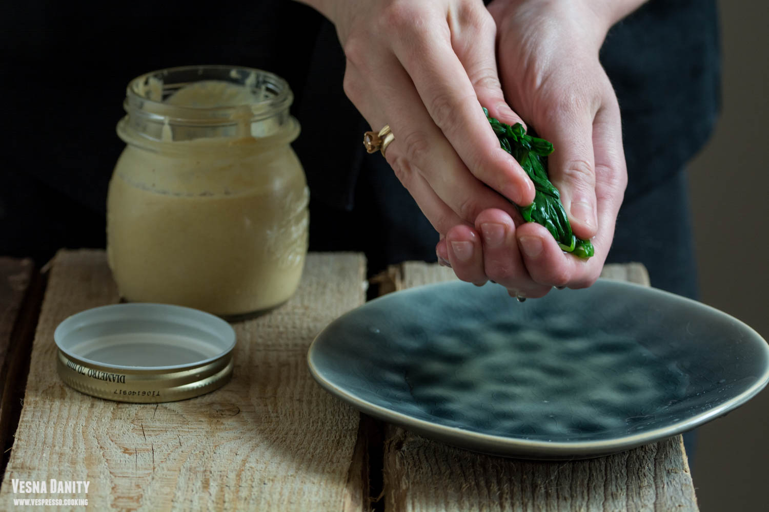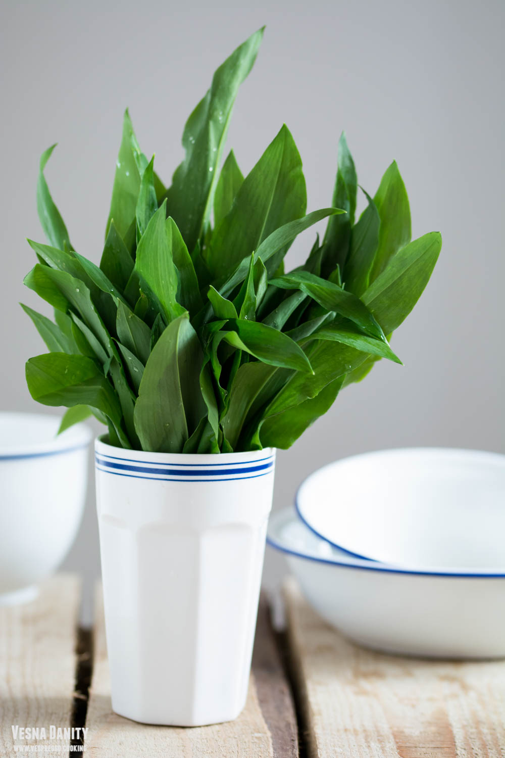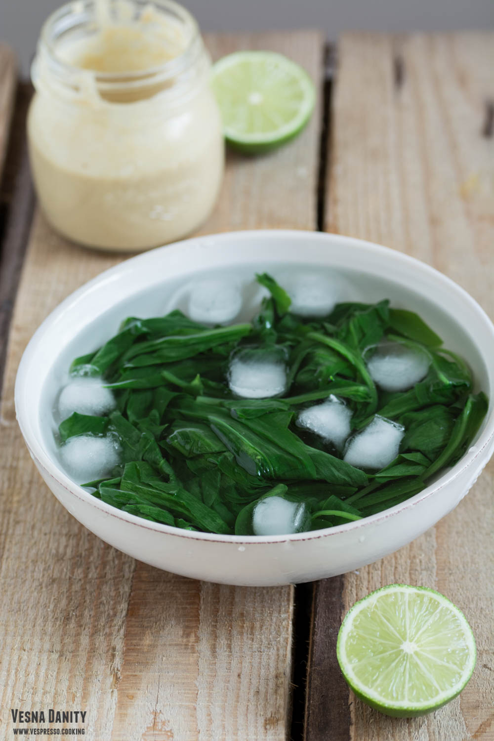 1. Am blanșat leurda. Am pus la fiert 1l de apă. Am spălat frunzele de leurdă și le-am tăiat codițele fibroase. Când apa a început să fiarbă am adăugat leurda, am redus focul la minimum și am opărit-o pentru 40 de secunde. Între timp am pregătit un vas cu apă rece în care am adăugat vreo 10 cuburi de gheață. După cele 40 de secunde am strecurat leurda și am așezat-o rapid în bolul cu apă foarte rece. După ce leurda s-a răcit complet am strecurat-o și am stors-o de excesul de apă cu ajutorul mâinilor.