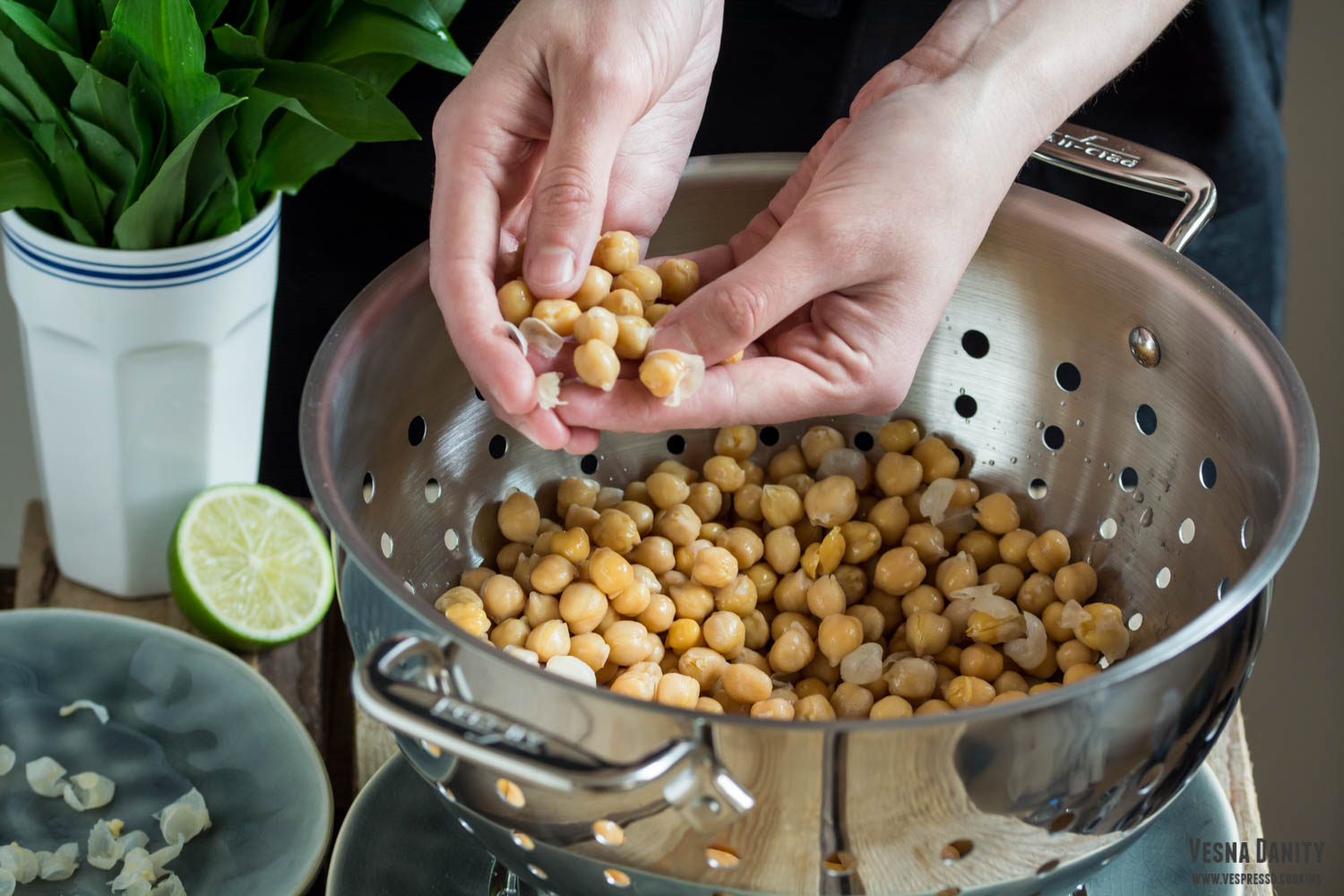 2. Hummus. Am strecurat boabele de năut cu ajutorul unei strecurătoare, după care le-am clătit sub jetul de apă. Am luat câte 8 – 10 boabe și le-am frecat între palme pentru a le înlătura cojile – pasul acesta este opțional, dar contribuie la obținerea unui hummus mai cremos.