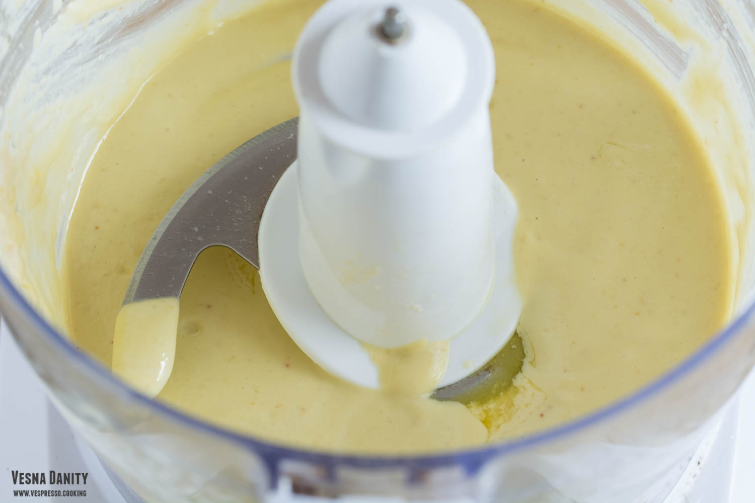 4. Cu robotul pornit, am turnat prima lingură de ulei și am mixat. Am procedat la fel și cu celelalte 2 linguri. În acest moment amestecul avea consistența unei maioneze (poză).