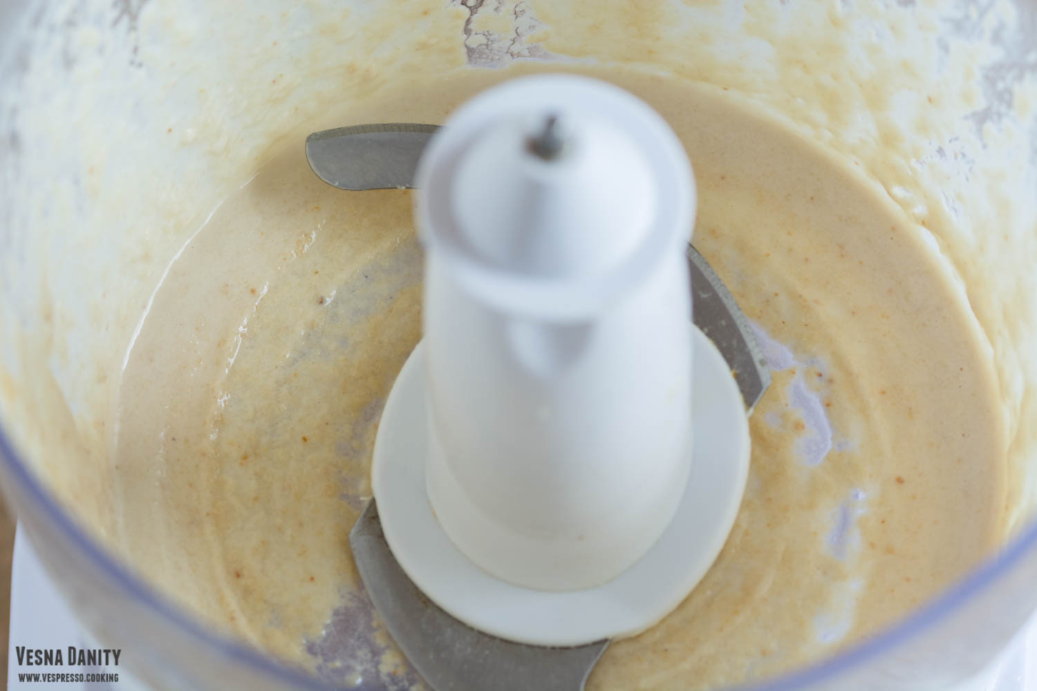 3. Am așezat pasta de susan (tahini) și sucul de lămâie în vasul robotului de bucătărie și am mixat până când am obținut o emulsie.