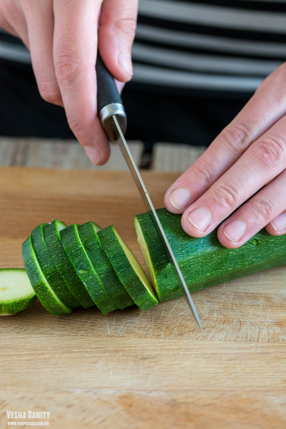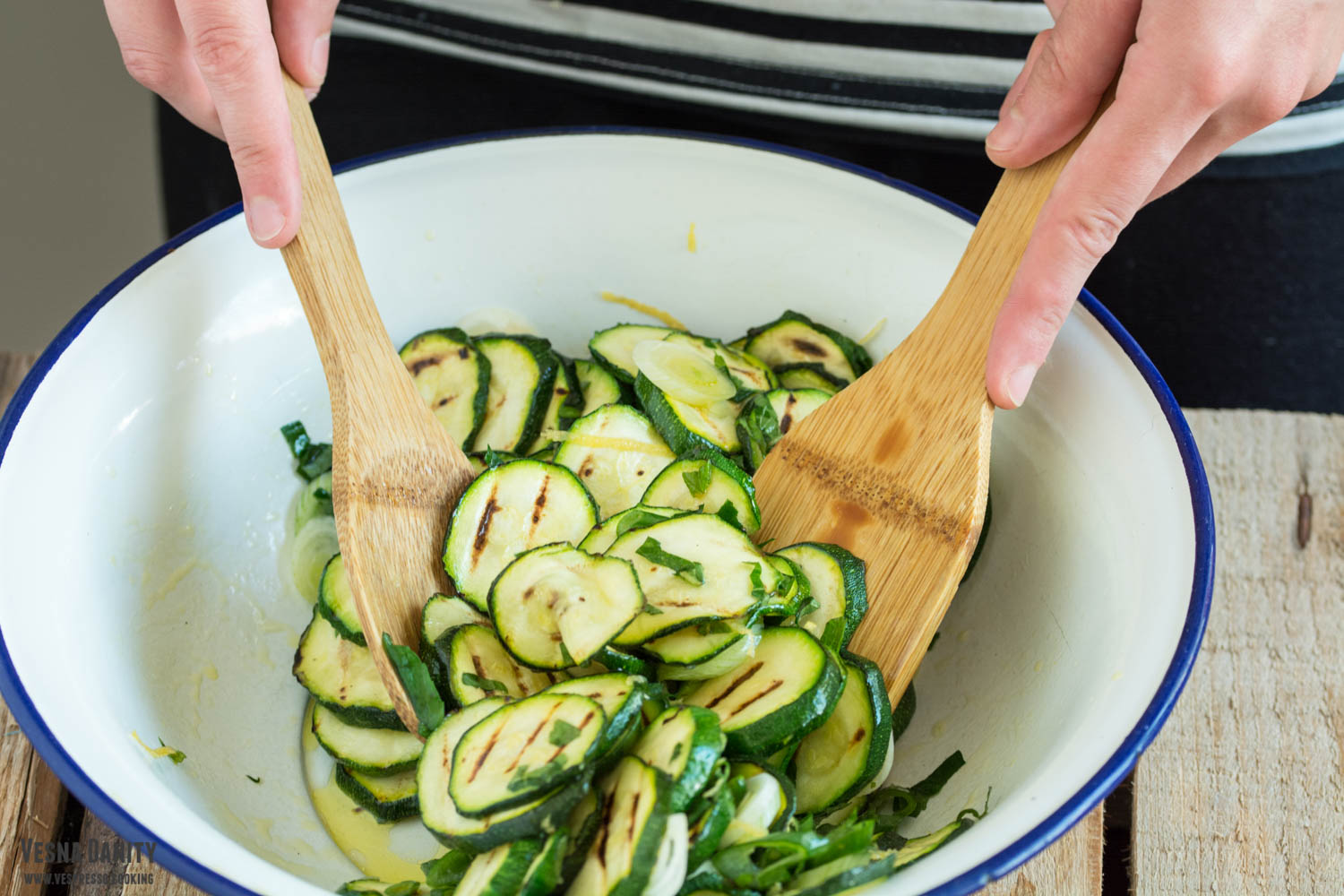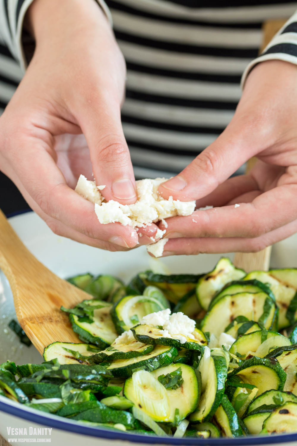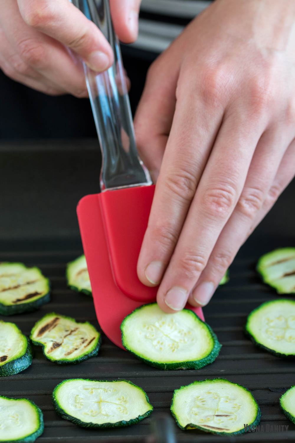 - Ardeiul gras. Am lust un disc de metal și l-am așezat pe ochiul cel mare aragazului. Am așezat ardeiul și l-am copt pe toate părțile, având grijă să îl înnegresc uniform. L-am așezat într-o oală mică de sosuri și l-am acoperit cu un capac pentru a face condens (în felul acesta fiindu-mi mult mai ușor să-l curăț). După 10 minute am decojit ardeiul, i-am înlăturat cotorul și semințele, l-am clătit și l-am uscat cu un prosop de hârtie, după care l-am tăiat în fâsii late de 1 deget.