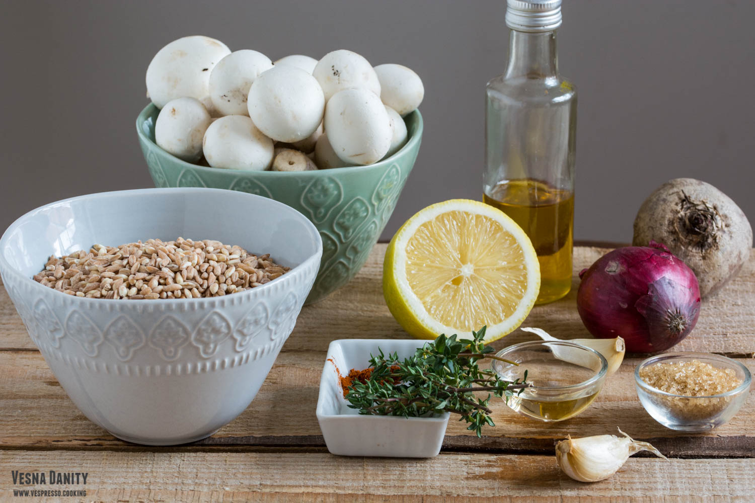 - Am amestecat farro cu ciupercile sotate, am adăugat 1 lingură de ulei de măsline și am asezonat cu sare. Am așezat salata în farfurii și am garnisit-o cu ceapa murată.