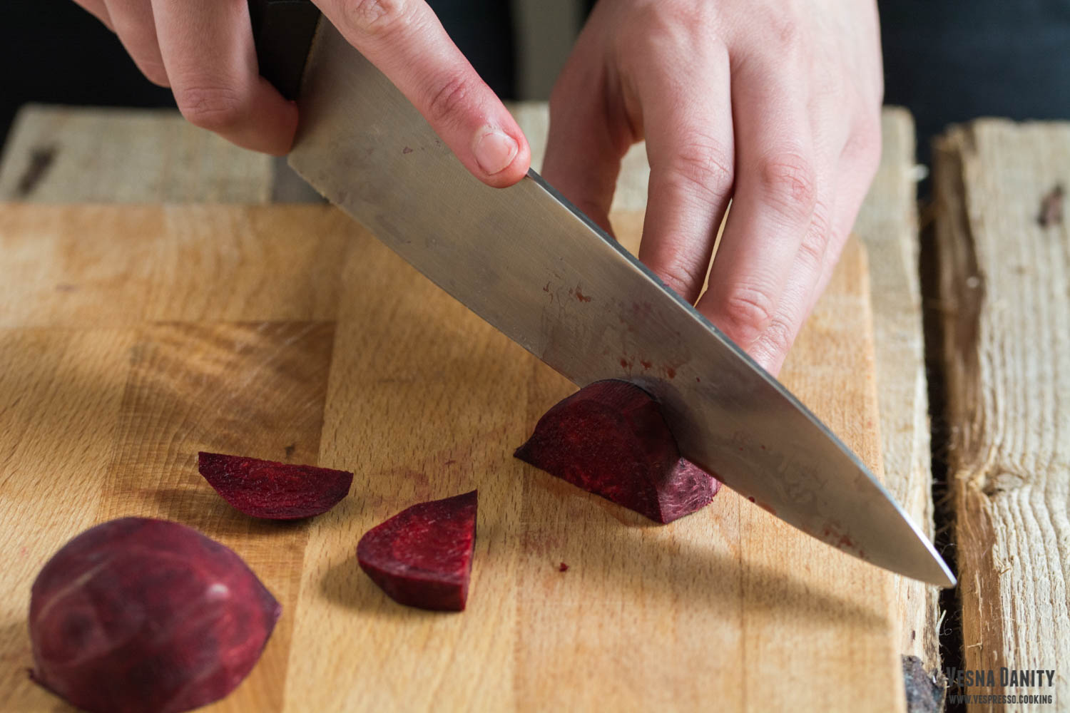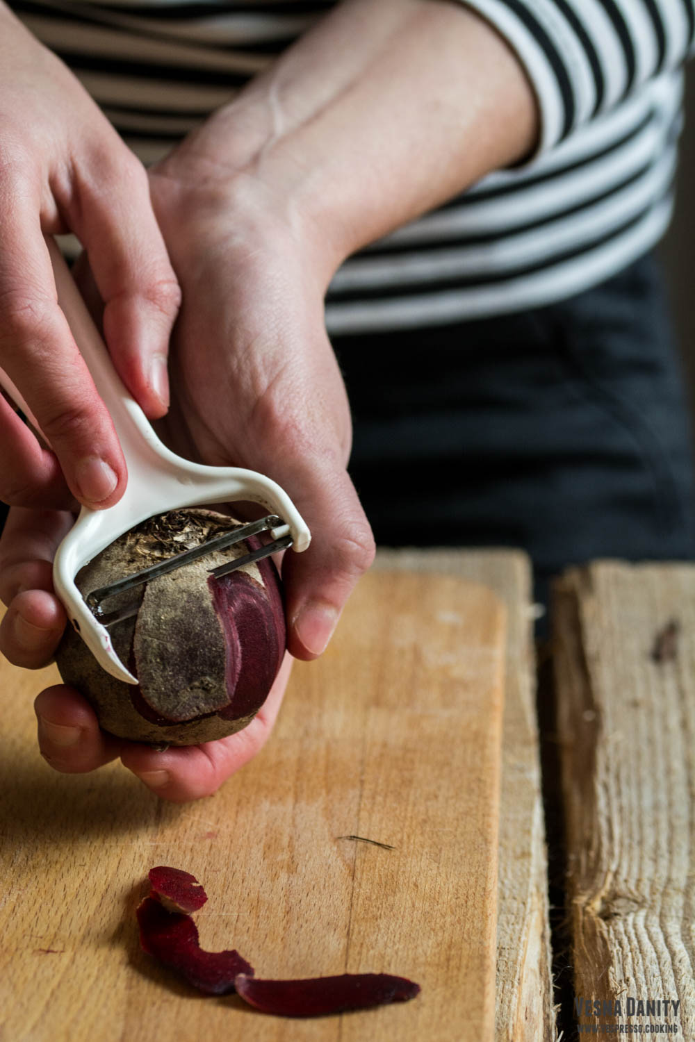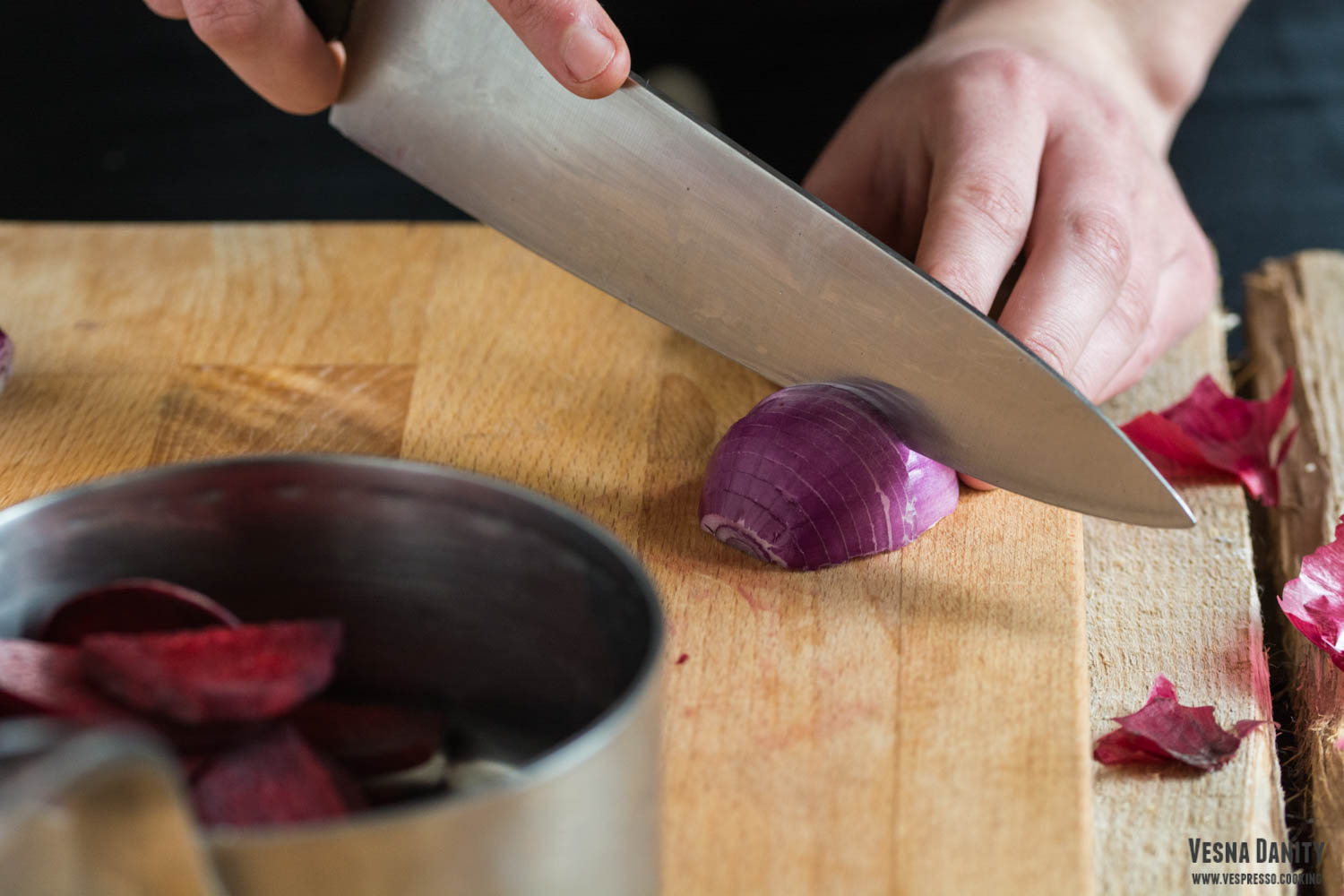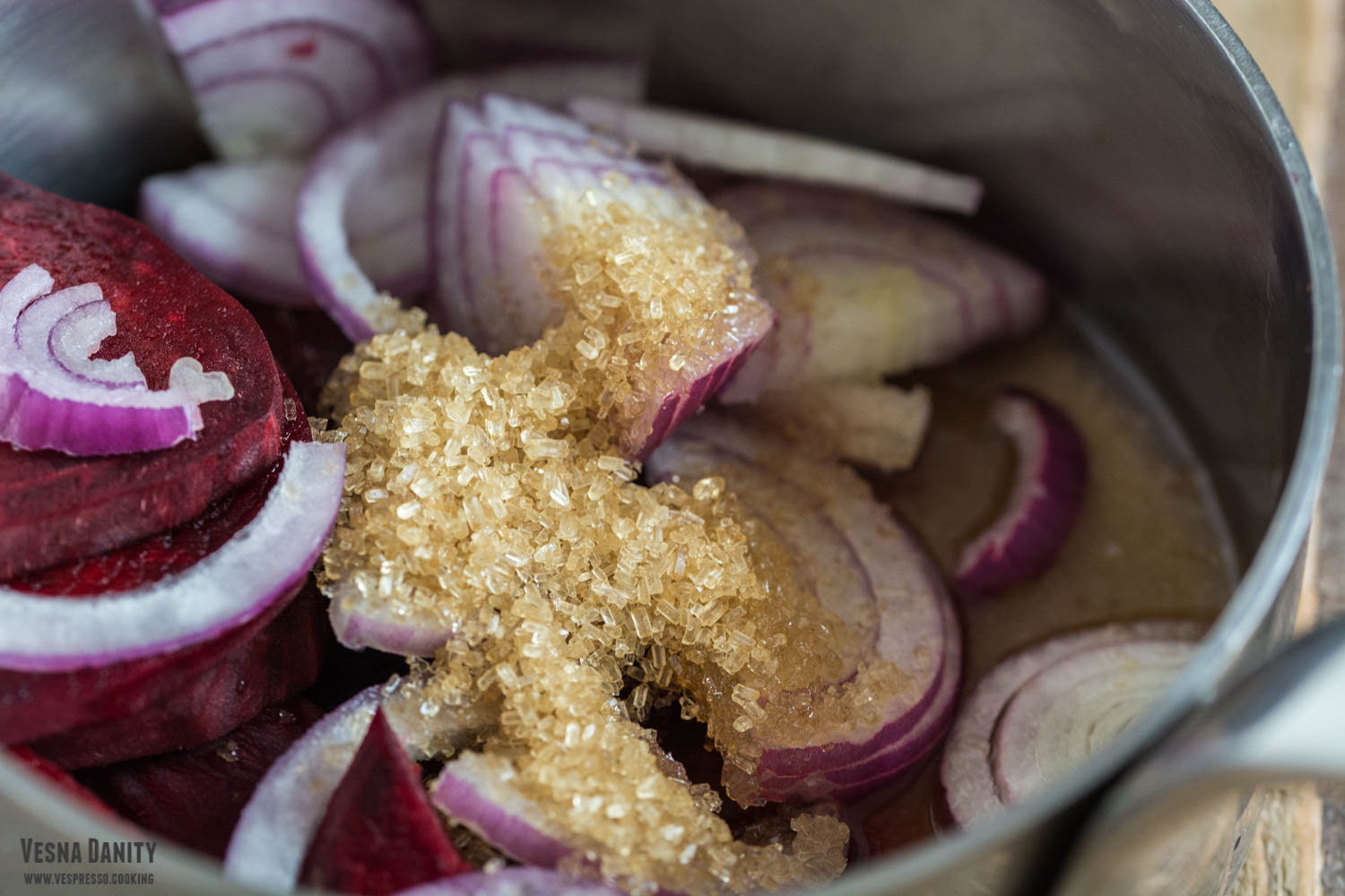 - Între timp am decojit sfecla cu un peeler de legume și am tăiat-o în felii subțiri, după care am așezat-o într-o oală mică. Am decojit ceapa, am înjumătățit-o, după care am felit-o subțire. Am așezat feliile de ceapă peste sfeclă, după care am adăugat o jumătate de cană de apă, cele 2 linguri de zahăr și cele 2 linguri de oțet. Am pus oala pe foc și am așteptat ca lichidul să dea în clocot, după care am redus focul la minimum și am mai lăsat oala la fiert pentru 1 minut. După un minut am lăsat oala deoparte, pentru ca ceapa să se marineze.