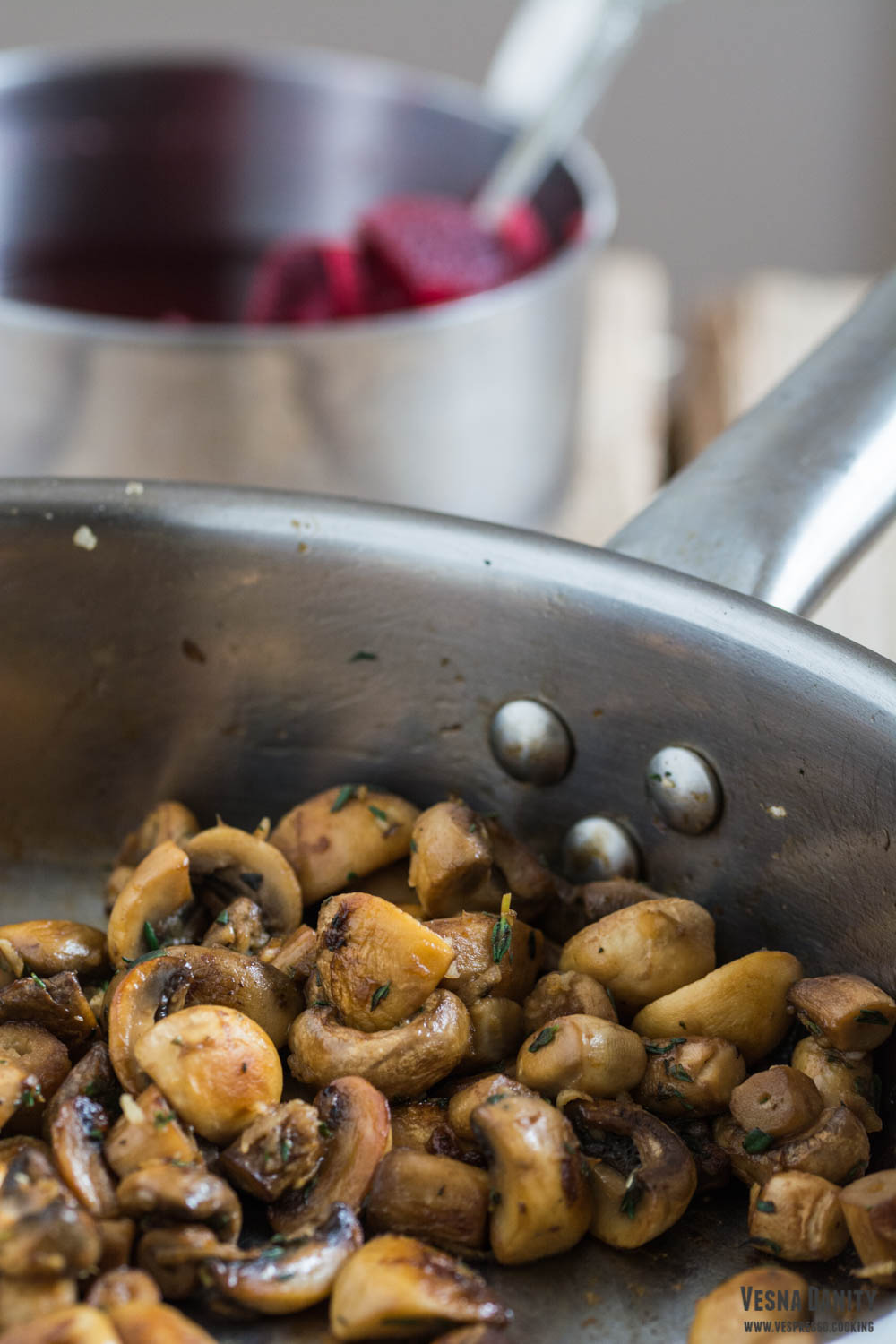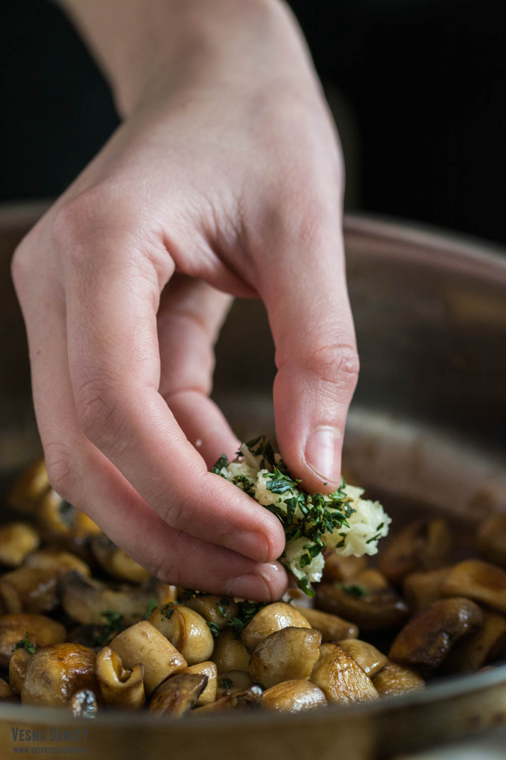 - Între timp am curățat ciupercile cu un burete de vase curat, le-am îndepărtat piciorușele și am înjumătățit pălărioarele. Am luat o tigaie, am adăugat o lingură de ulei de măsline și pudra de chili și am pus tigaia la încins la foc mediu-mare. Am sotat ciupercile (pălărioarele împreună cu piciorușele) până când lichidul s-a evaporat și ele s-au rumenit frumos. Am adăugat usturoiul și cimbrul tocat, am amestecat încontinuu timp de 1 minut, după care am deglasat tigaia cu 1 lingură de suc de lămâie.