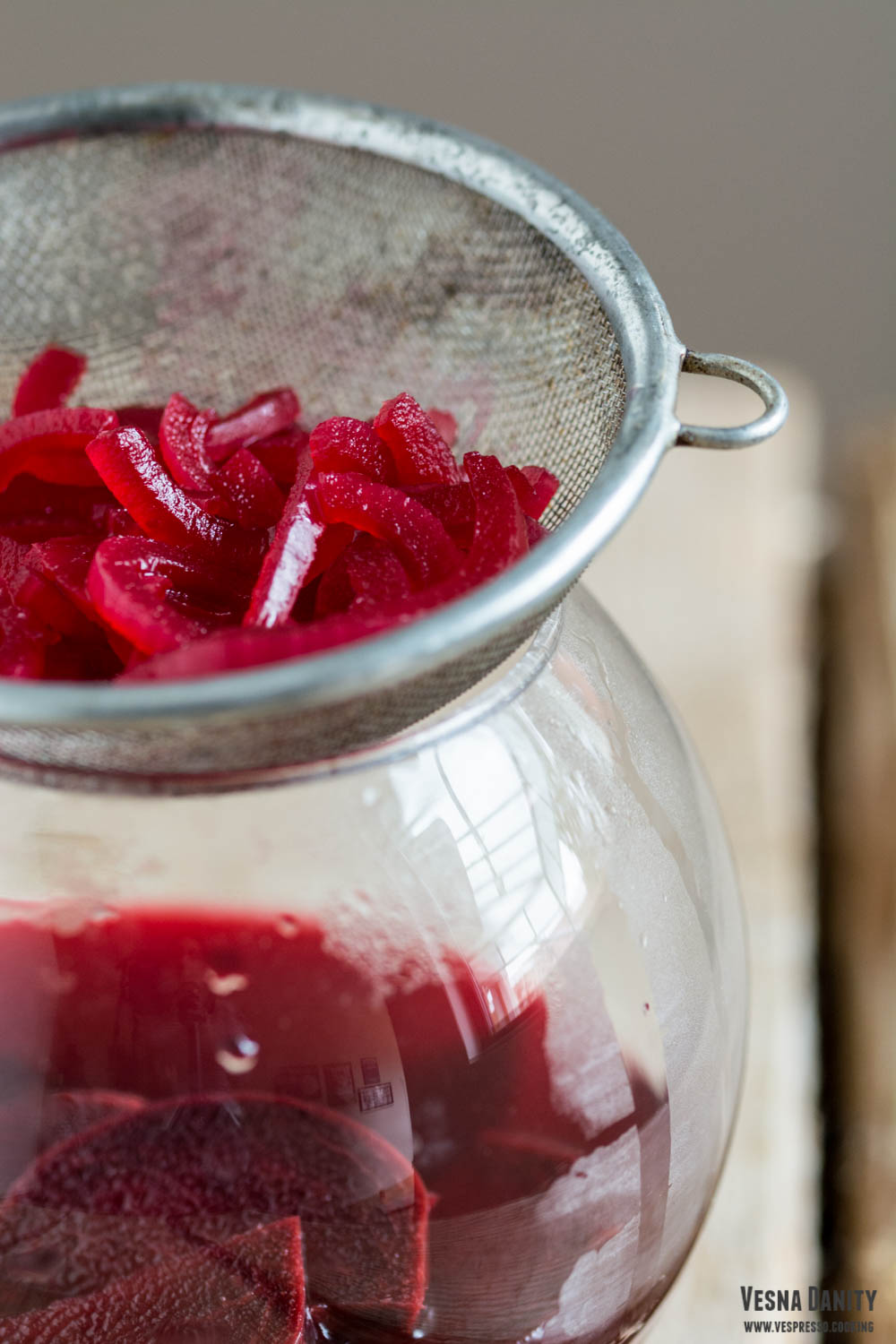 - Am strecurat ceapa cu ajutorul unei site, după care am eliminat bucățile de sfeclă.