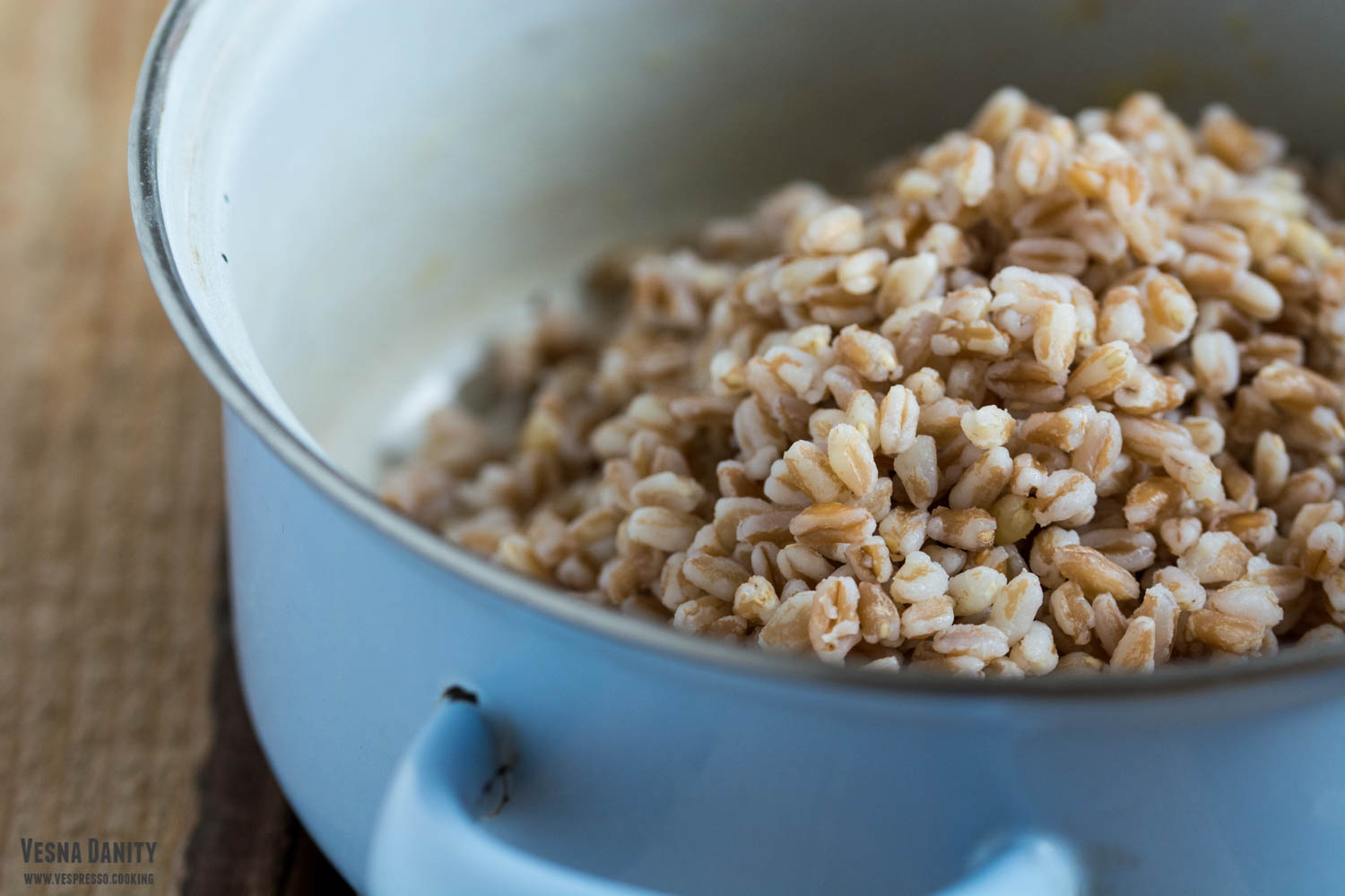 - Am umplut o oală de sosuri cu apă, am acoperit-o și am pus-o la fiert. Când apa a început să clocotească, am adăugat 1 lingură de sare. Am adăugat farro, am redus focul la minimum și l-am fiert până când s-a înmuiat, păstrându-și totuși consistența cauciucată (al meu a fost gata în 20 de minute).