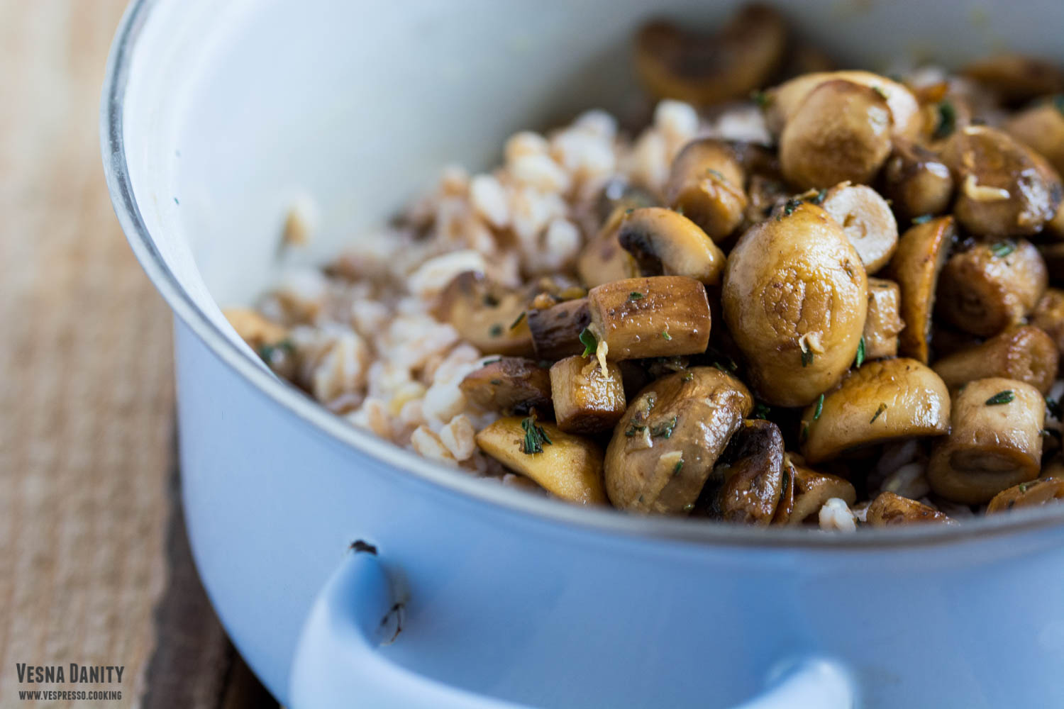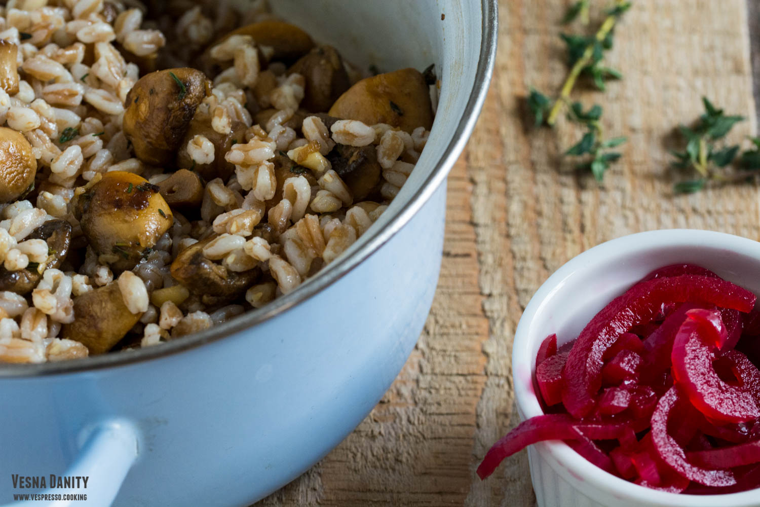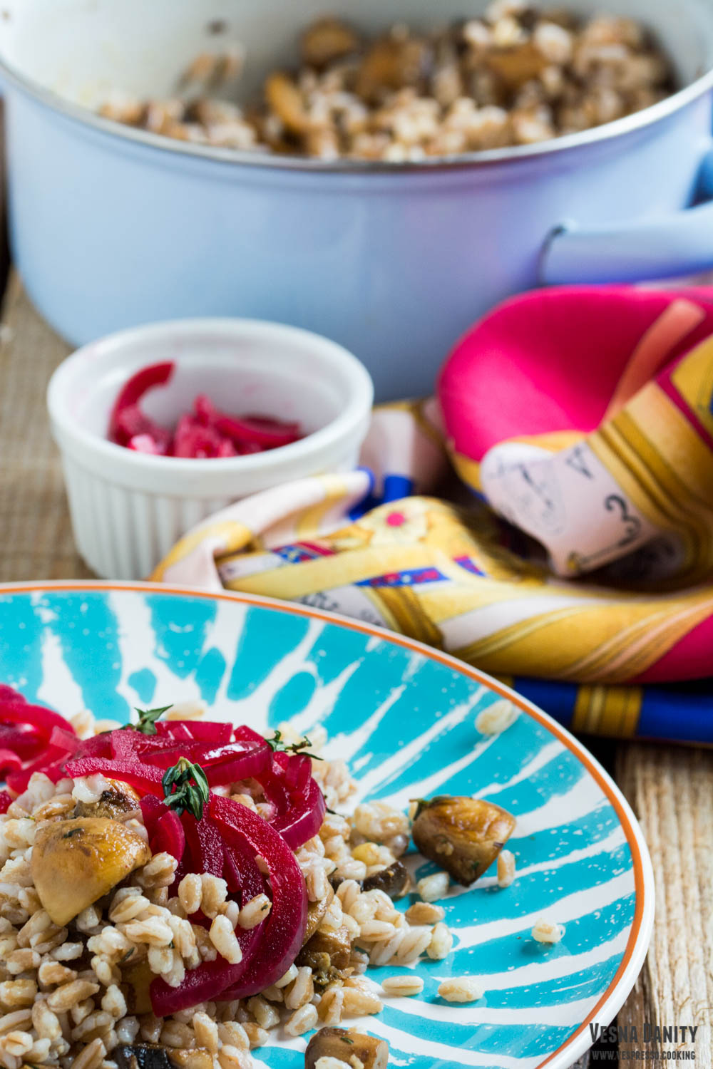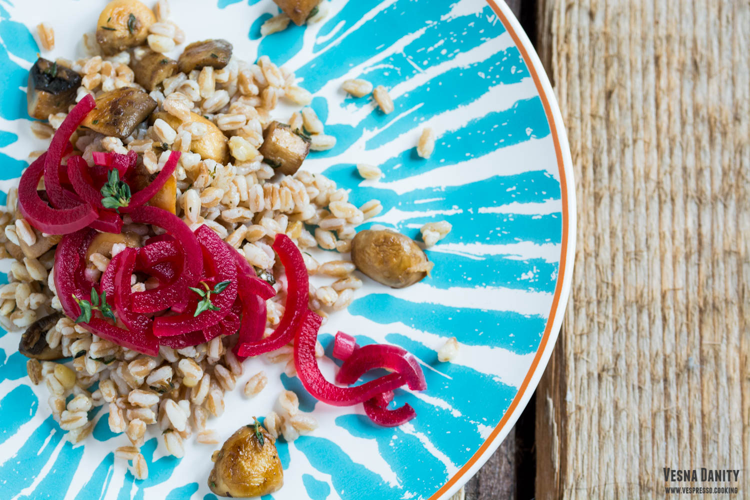 Se prepară la fel ca pastele făinoase, mai precis se fierbe în apă cu sare, timpul de gătire variind între 25 și 45 de minute. Astăzi l-am servit sub forma unei salate absolut divine, poate cea mai bună salată pe care am gustat-o în ultima perioadă, dacă nu vreodată. O salată de farro cu ciuperci și ceapă murată, o salată plină de gust, culoare și texturi contrastante. Până când farro fierbea domol în oală, am feliat o ceapă roșie și am murat-o într-o soluție de apă cu zahăr brun și oțet de mere. În soluția aceasta am feliat și o sfeclă mititică, aceasta oferindu-i panglicilor de ceapă o culoare roz-zmeură aproape hipnotică. După ce am pus ceapa la murat, am rumenit niște ciuperci champignon în ulei de măsline asezonat cu chili, iar la final le-am înmiresmat cu usturoi tocat fin și cimbru proaspăt! O minune, nu alta!