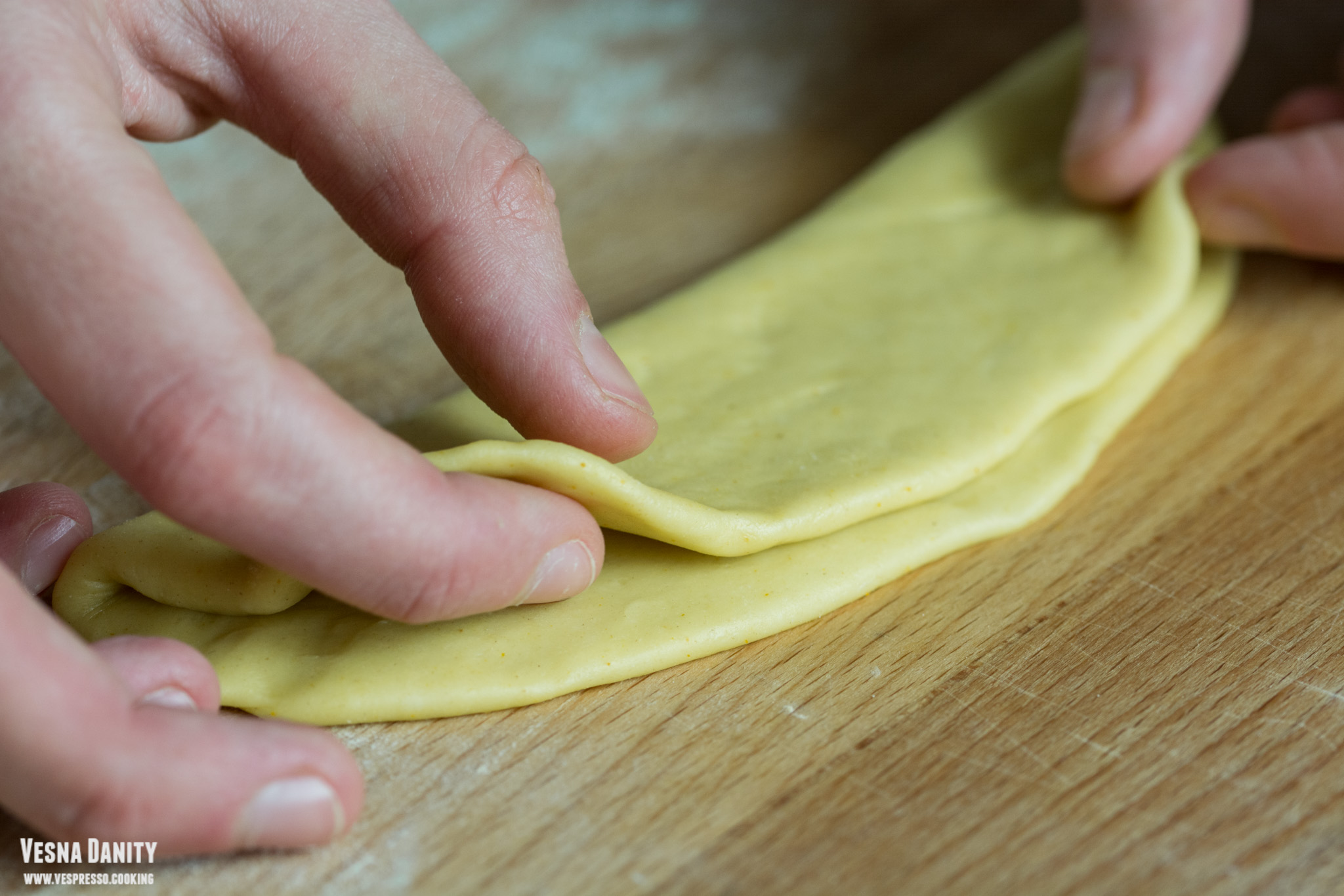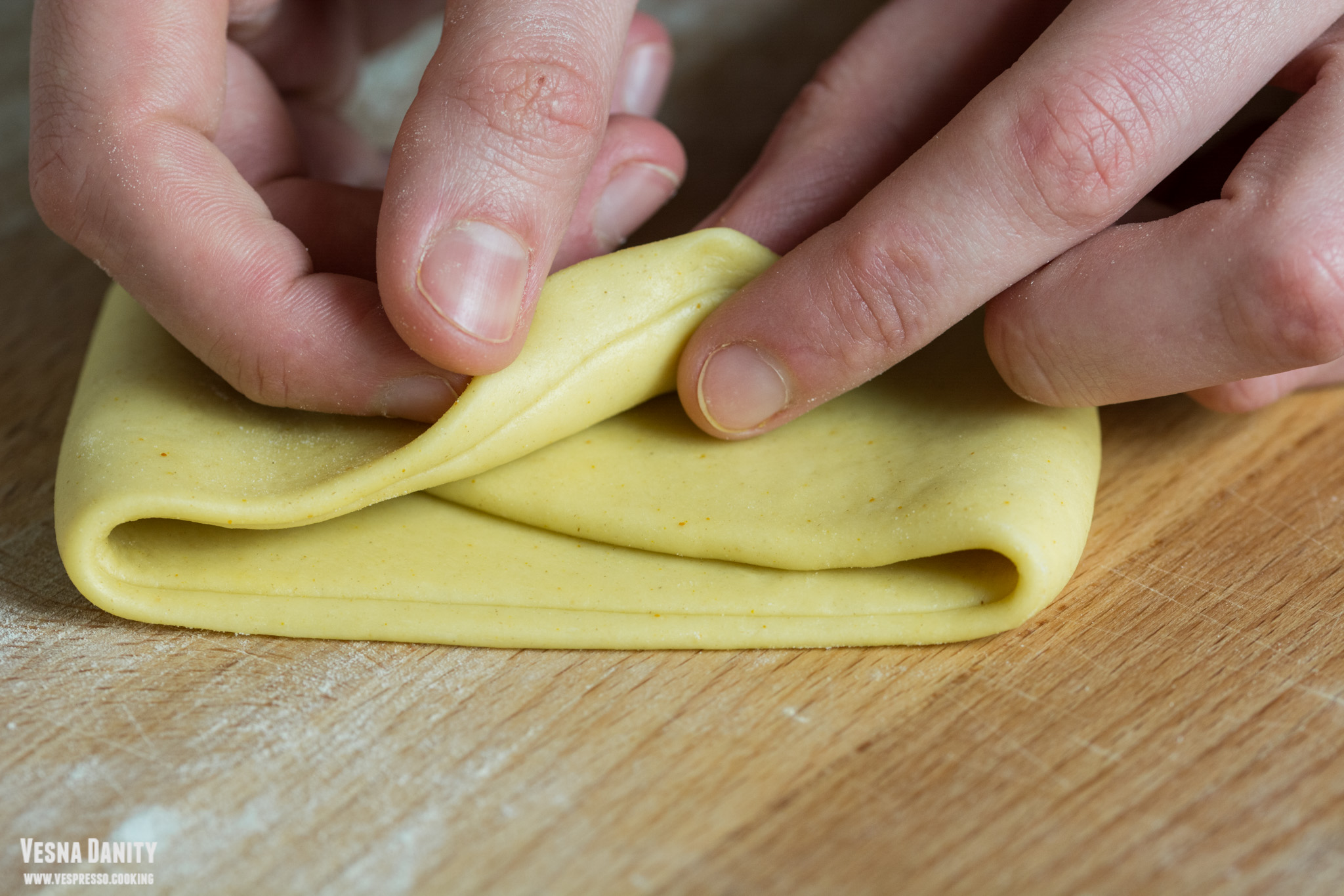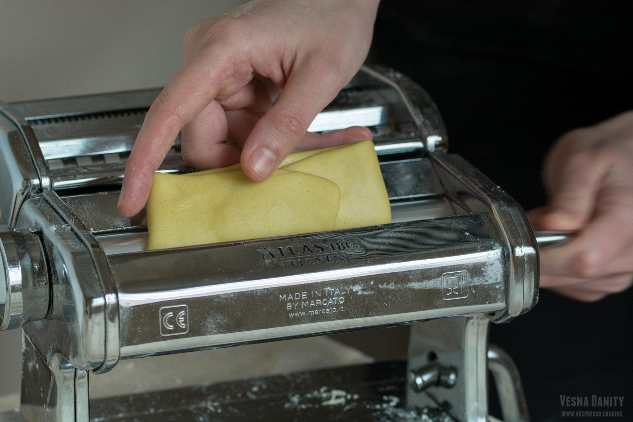 - Tăierea tăiețeilor – Pașii de mai jos se pot realiza la fel de bine și cu un sucitor și un cuțit ascuțit, exact ca aici. Am scos aluatul din frigider și l-am împărțit în 6, după care am modelat fiecare bucată sub forma unei bile. Am luat prima bilă și am aplatizat-o cu degetele, după care am pliat-o. Am trecut fiecare bucată de aluat prin mașina de întins, începând cu diametrul cel mai mare și m-am oprit la treapta 5. Am trecut aluatul prin fiecare treaptă de două ori, doar prin treapta 5 l-am trecut o singură dată. rezumat: pliere, tr1x2, pliere, tr2x2, tr3x2, tr4 x2, tr5x1