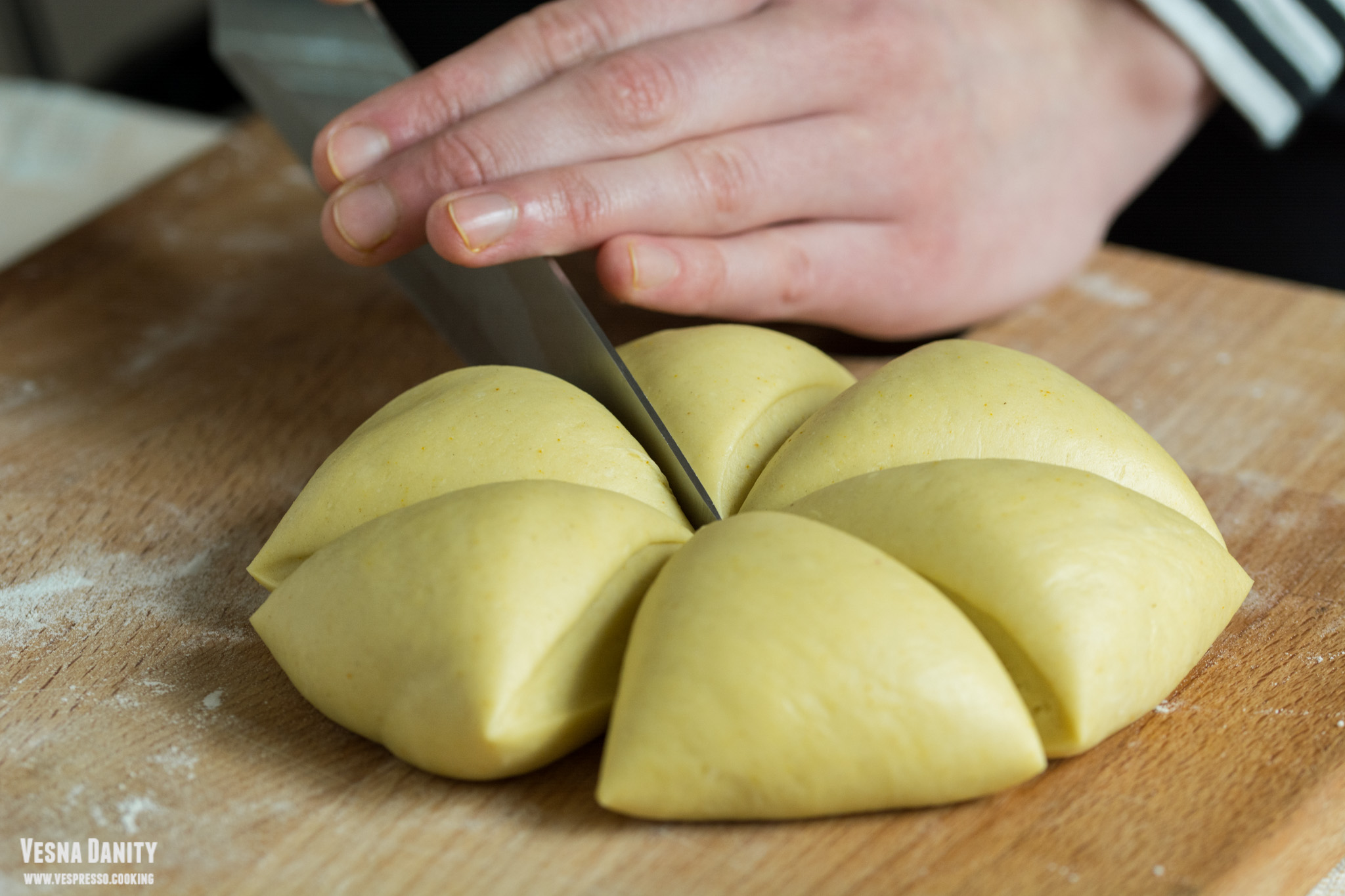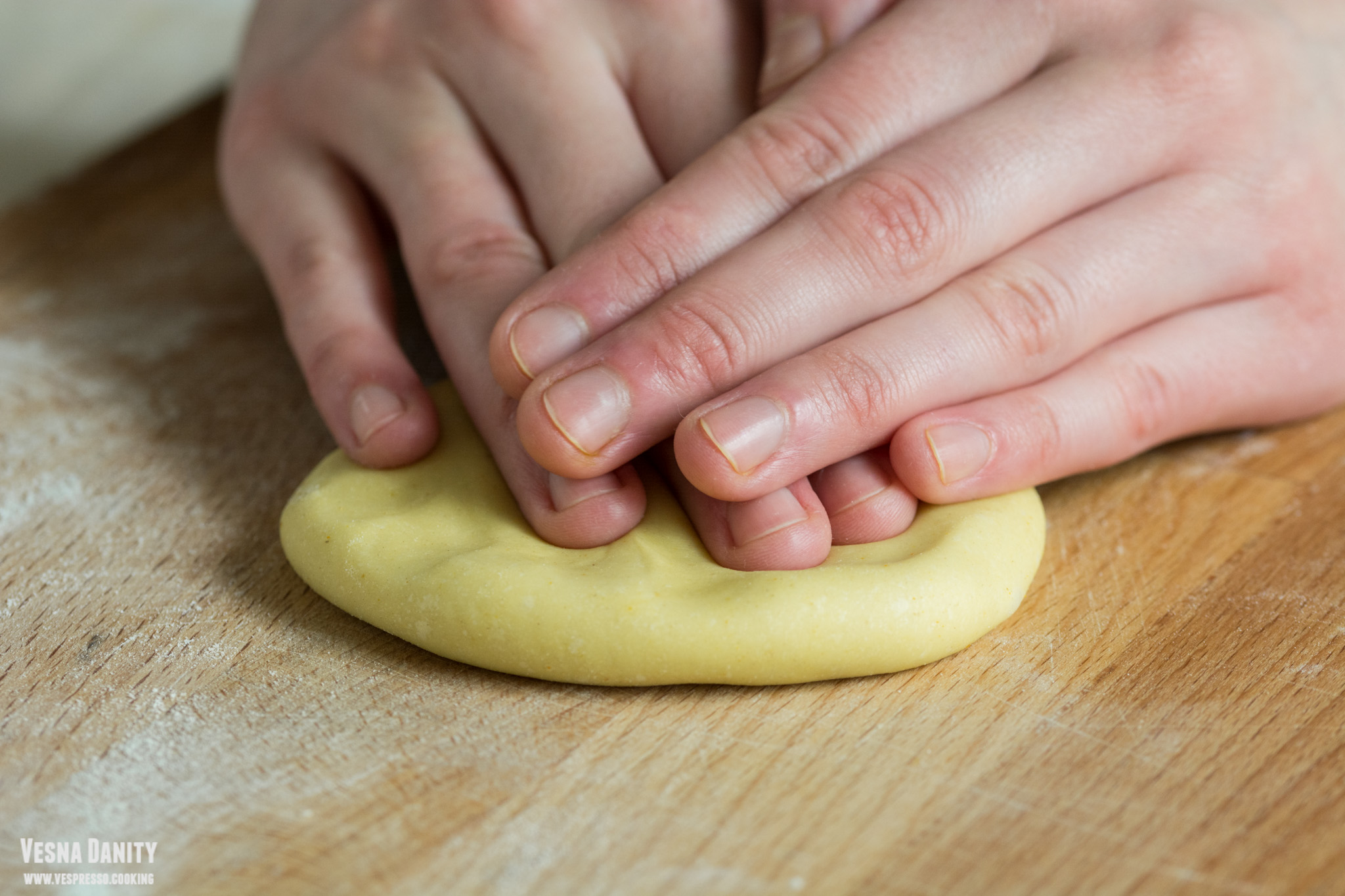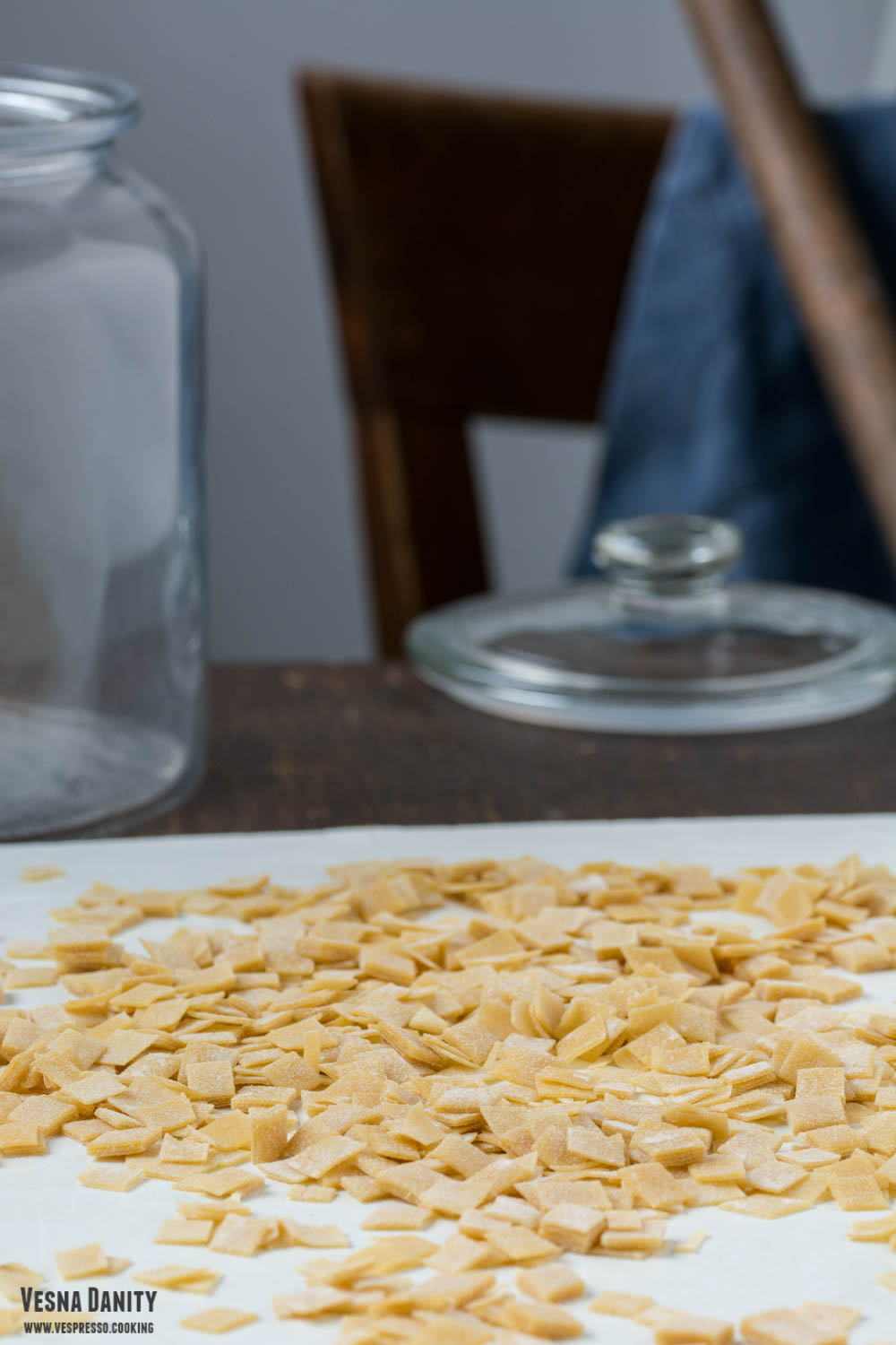 - Tăierea tăiețeilor – Pașii de mai jos se pot realiza la fel de bine și cu un sucitor și un cuțit ascuțit, exact ca aici. Am scos aluatul din frigider și l-am împărțit în 6, după care am modelat fiecare bucată sub forma unei bile. Am luat prima bilă și am aplatizat-o cu degetele, după care am pliat-o. Am trecut fiecare bucată de aluat prin mașina de întins, începând cu diametrul cel mai mare și m-am oprit la treapta 5. Am trecut aluatul prin fiecare treaptă de două ori, doar prin treapta 5 l-am trecut o singură dată. rezumat: pliere, tr1x2, pliere, tr2x2, tr3x2, tr4 x2, tr5x1