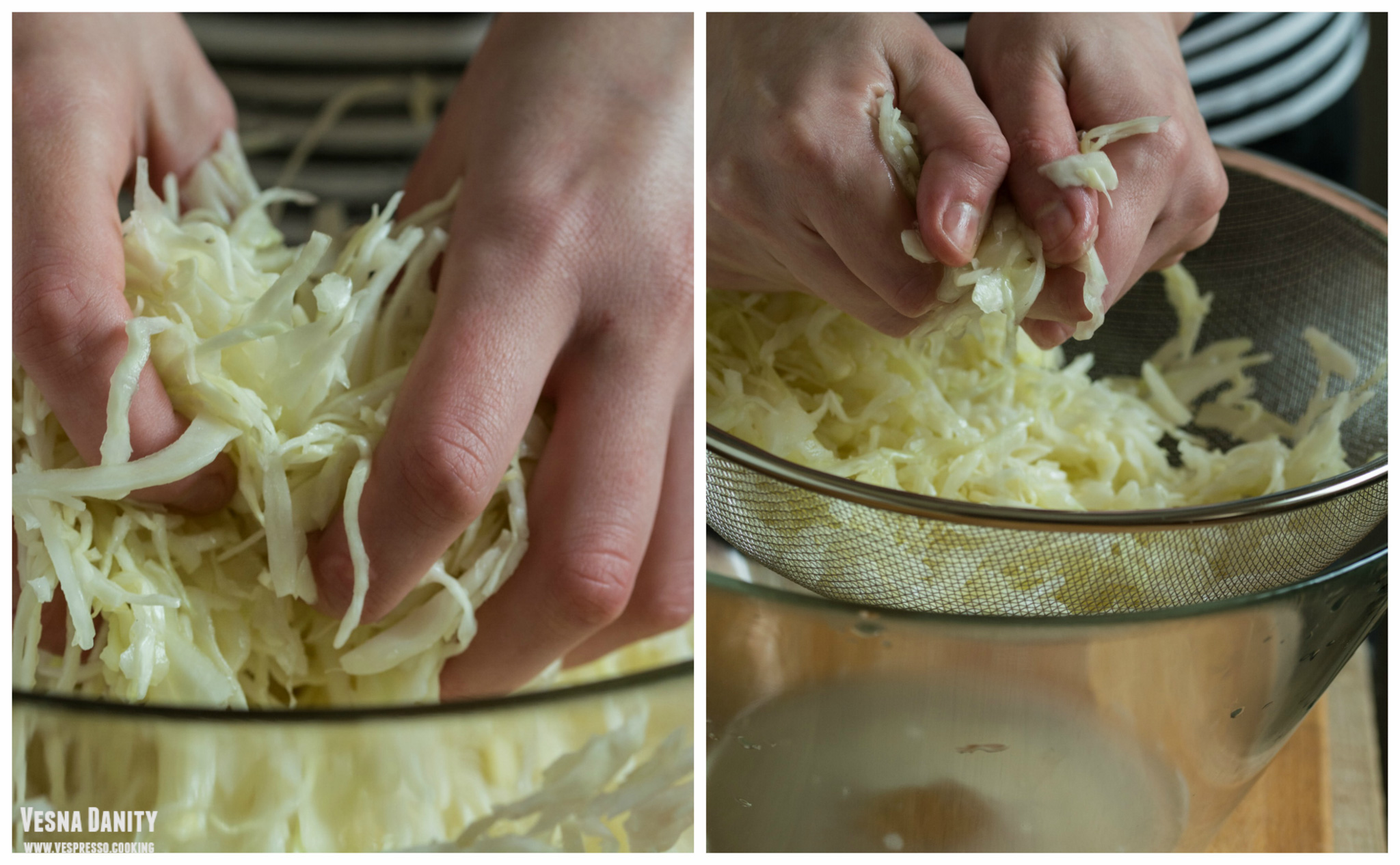 - Am împărțit varza în 4 bucăți, am tocat-o în fâșii subțiri, am așezat-o într-o strecurătoare iar strecurătoarea am așezat-o într-un bol (pentru ca zeama să se scurgă în bol). Am sărat-o și am frământat-o între degete, având grijă să înlătur bucățile mari și fibroase care mi-au ieșit în cale. Am lăsat varza deoparte până când m-am ocupat de ceapă.