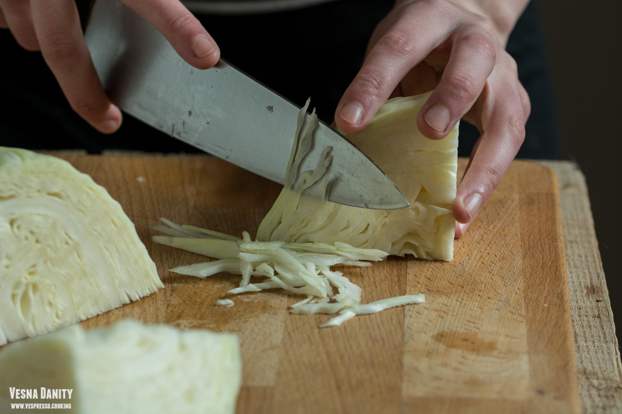 - Varza călită. Până ce aluatul s-a relaxat la frigider, m-am ocupat de varză. Am luat varza, i-am îndepărtat frunzele de la exterior, am spălat-o și am uscat-o cu un șervet de hârtie.