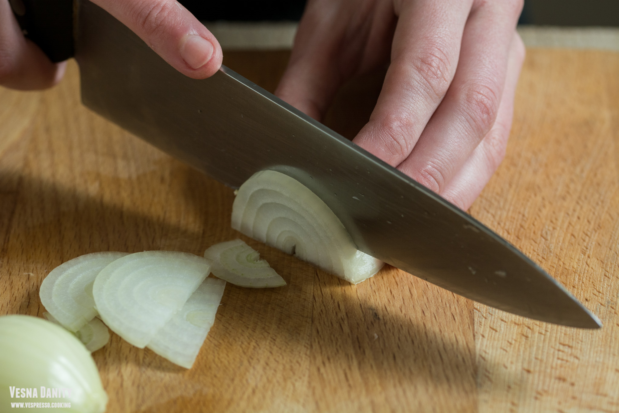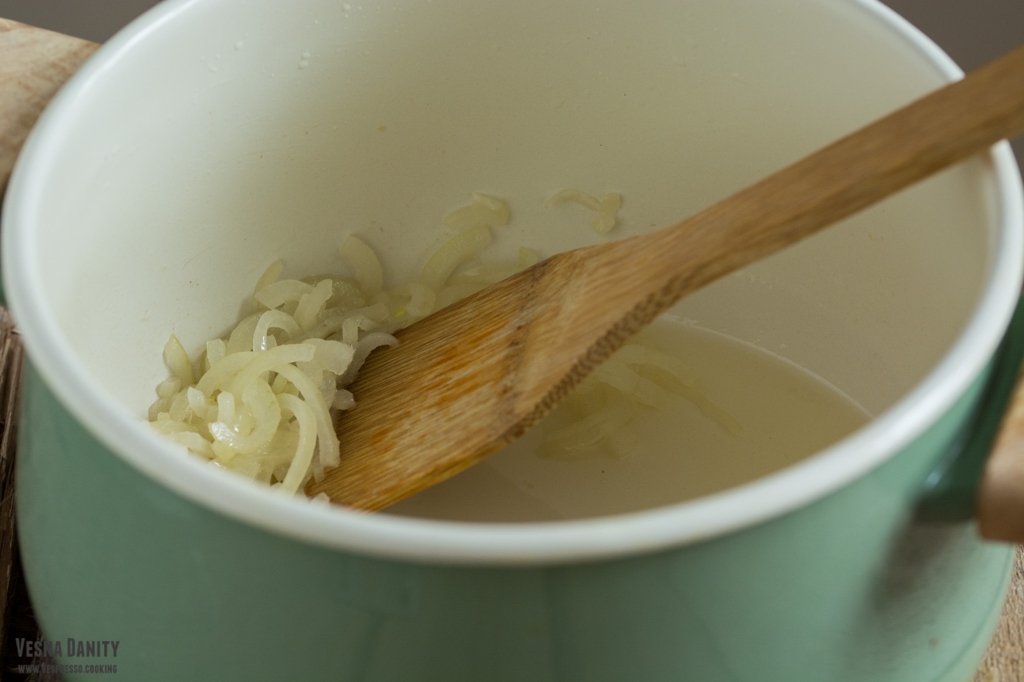 - Am curățat ceapa, am înjumătățit-o și am tocat-o solzi. Am încălzit cele 2 linguri de ulei într-o cratiță, am adăugat ceapa și am sotat-o la foc mediu până când a devenit translucidă.