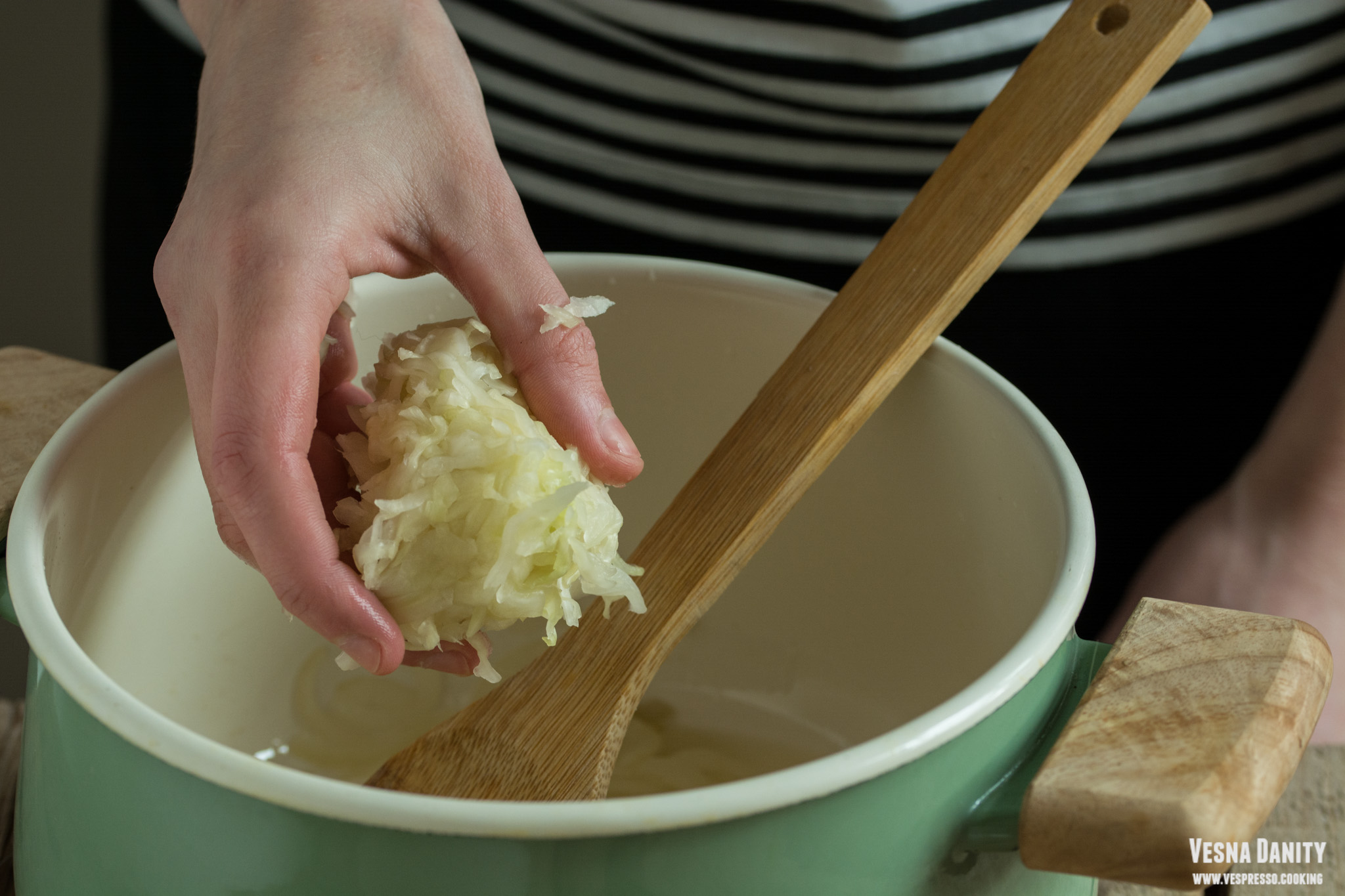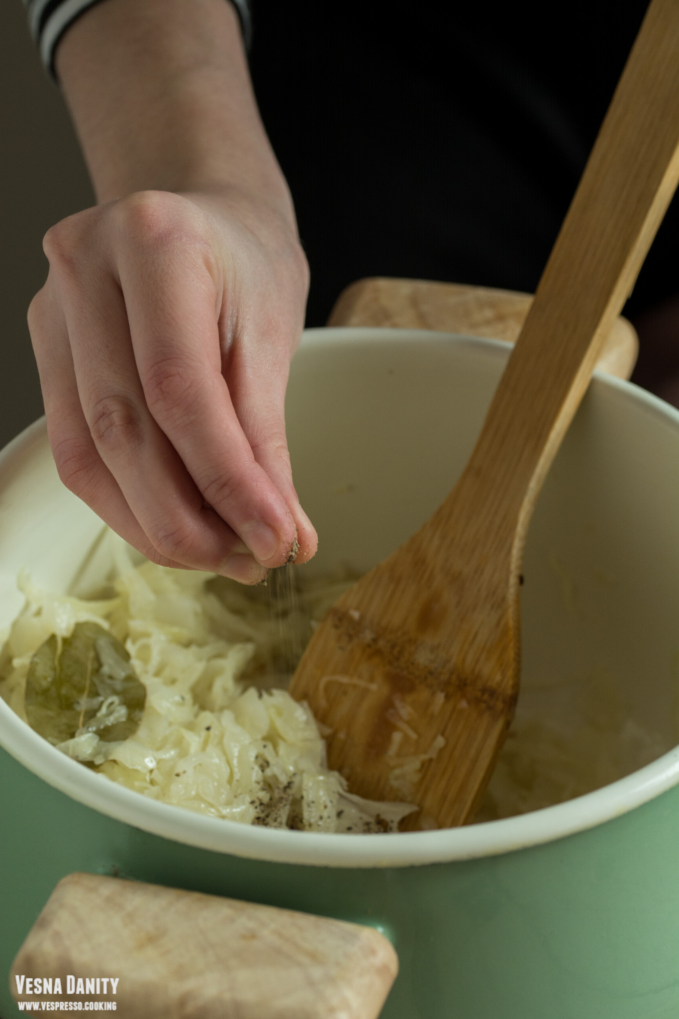 - Am stors varza de excesul de lichid cu ajutorul degetelor. Am adăugat varza peste ceapa sotată, am amestecat cu o lingură de lemn, am acoperit oala cu un capac și am redus focul la minimum. Am ținut varza pe foc până când s-a înmuiat (15 – 20 minute). La final am asezonat varza cu piper din belșug.