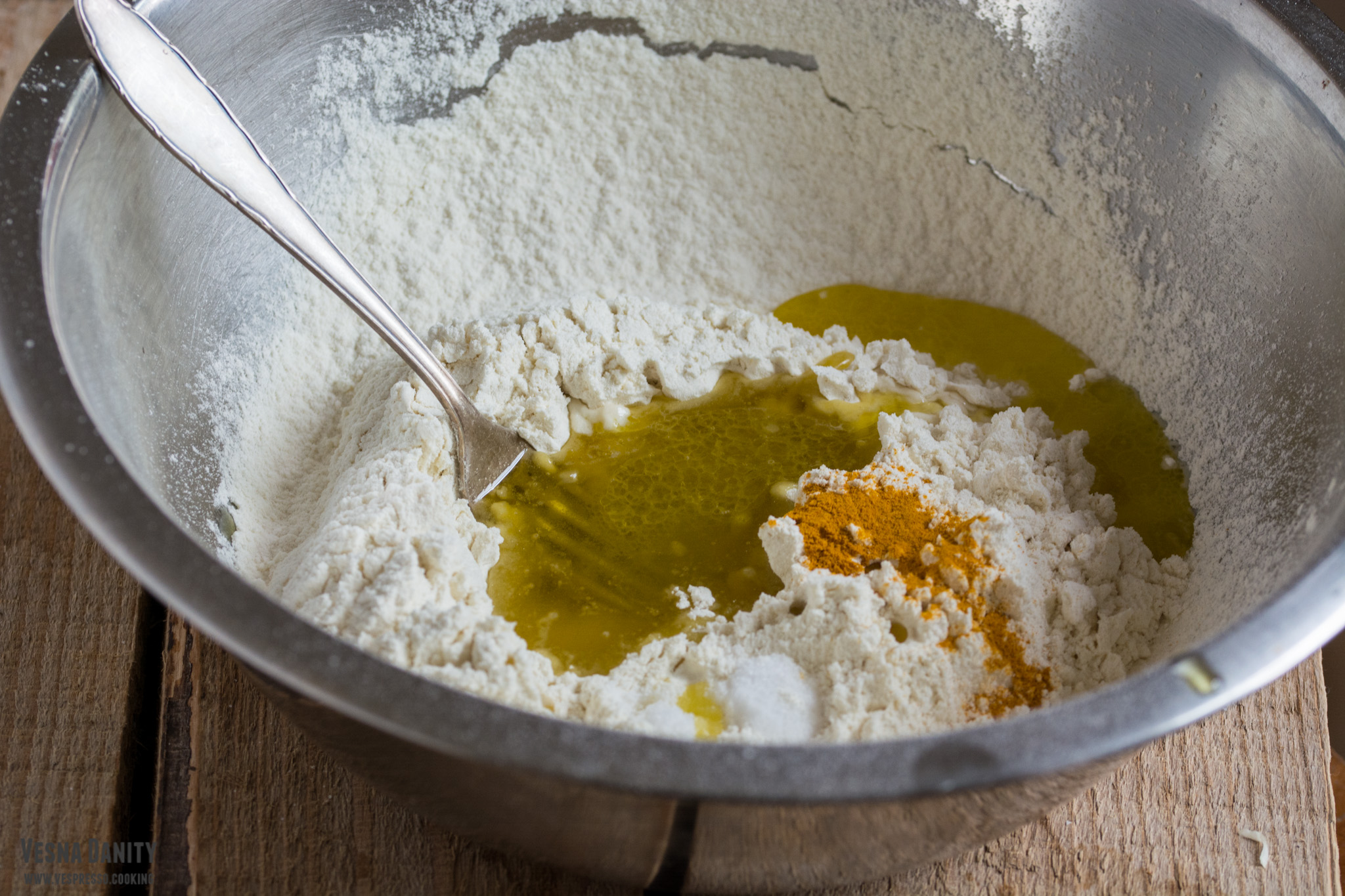 - Am format o adâncitură în mijlocul făinii, am turnat apa împreună cu uleiul de măsline și am amestecat cu o furculiță până am format o minge de aluat.
