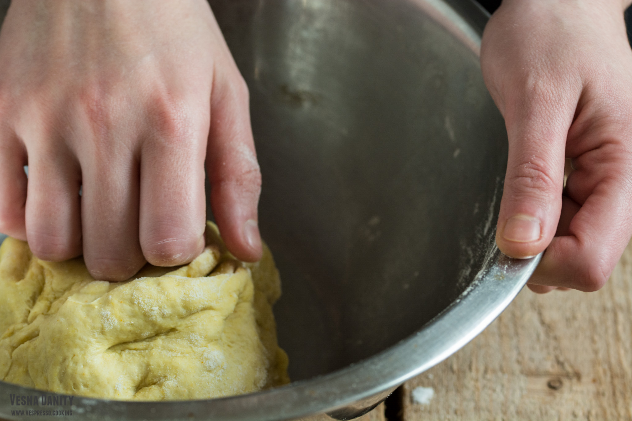 - Am mutat mingea de aluat pe suprafața de lucru pudrată cu făină și am frământat-o timp de 10 minute. După cele 10 minute de frământare, aluatul devenise elastic și neted la suprafață.