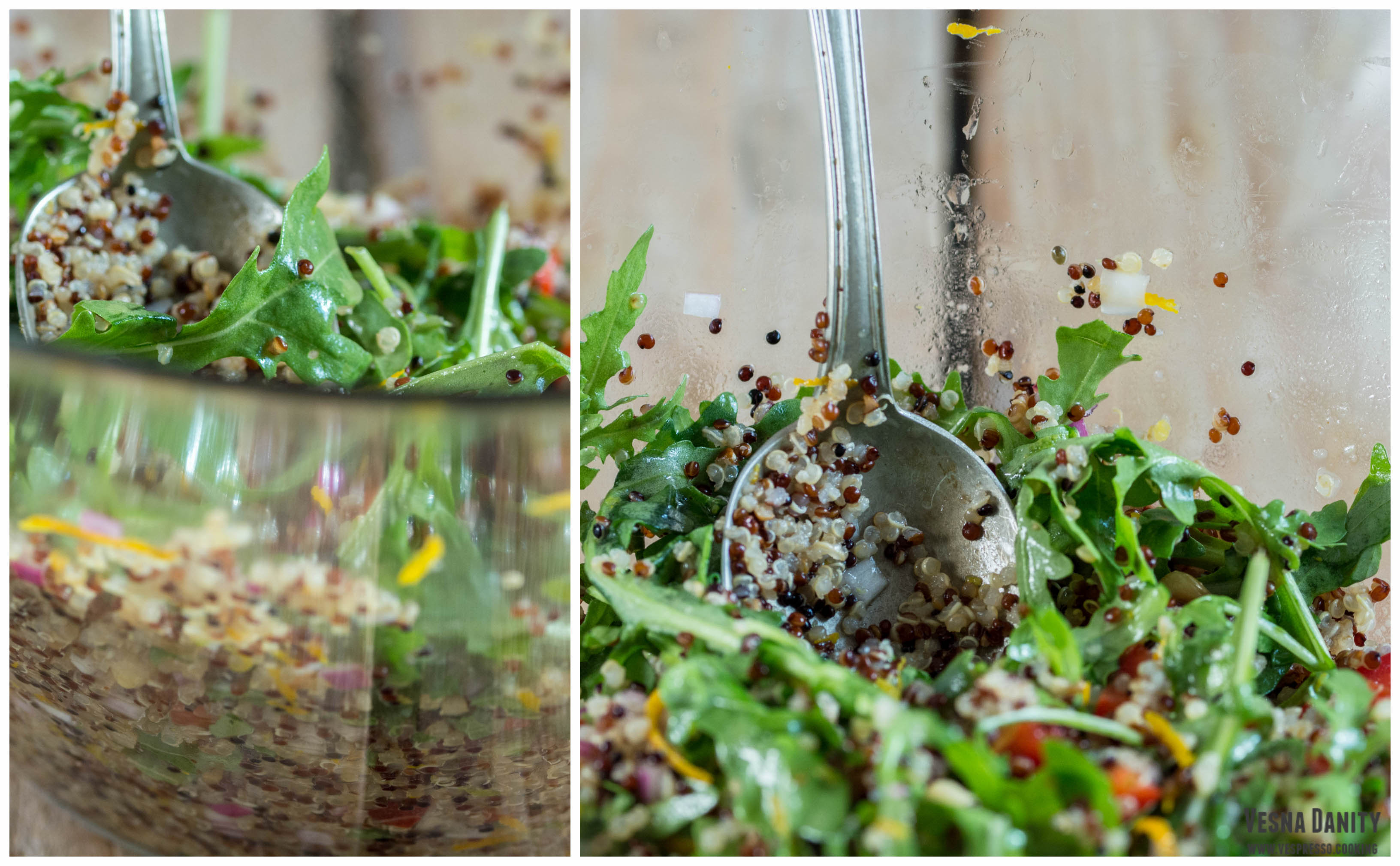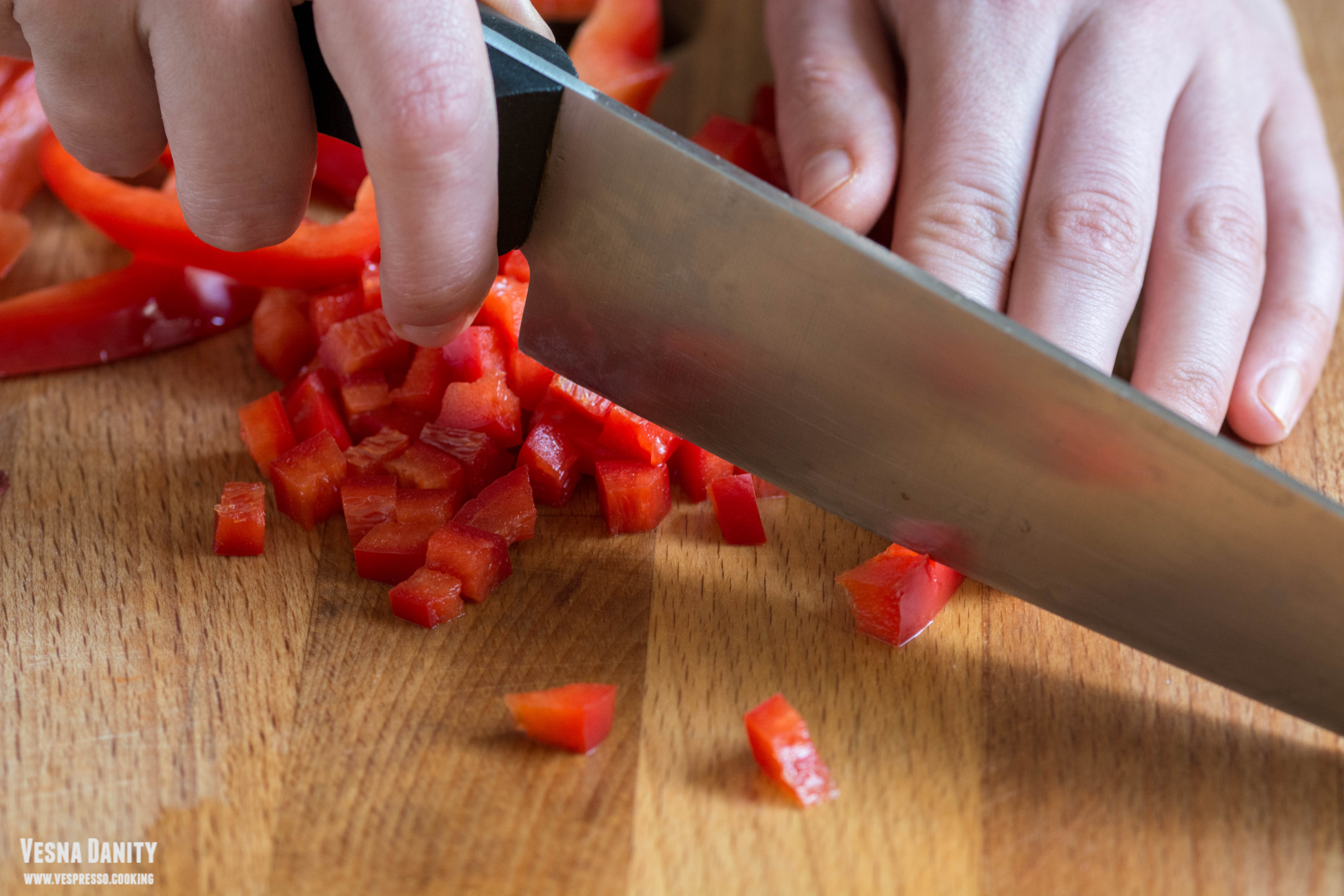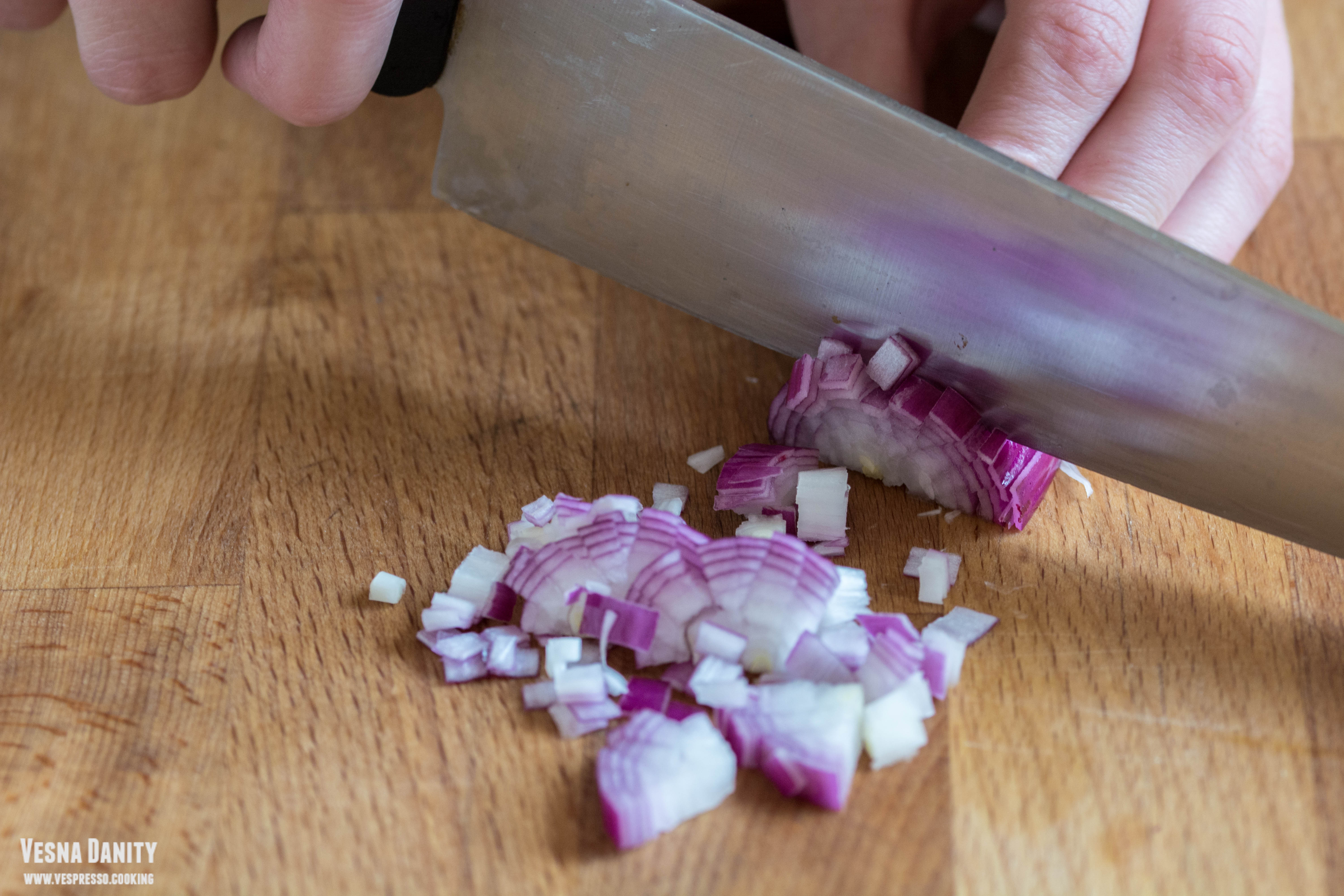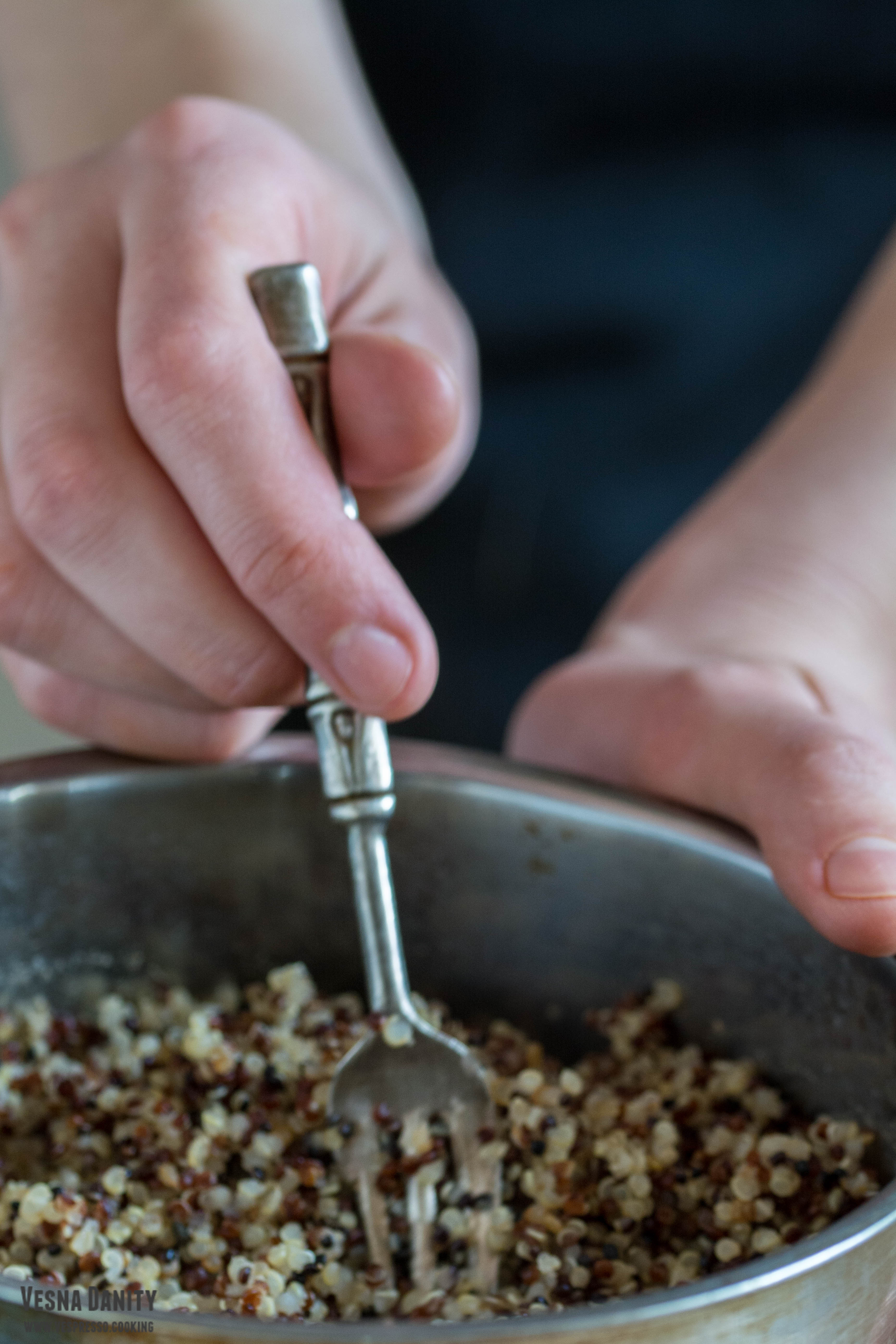 - Pregătirea ingredientelor. Am cântărit ingredientele. Am curățat merele, le-am tăiat în 4, am îndepărtat cotoarele, după care am împărțit fiecare sfert în 3 felii. Am râșnițat semințele de in (ele se pot zdrobi într-un mojar în lipsa unei râșnițe). Le-am hidratat în 9 linguri de apă, după care am lăsat amestecul deoparte pentru 5 minute.