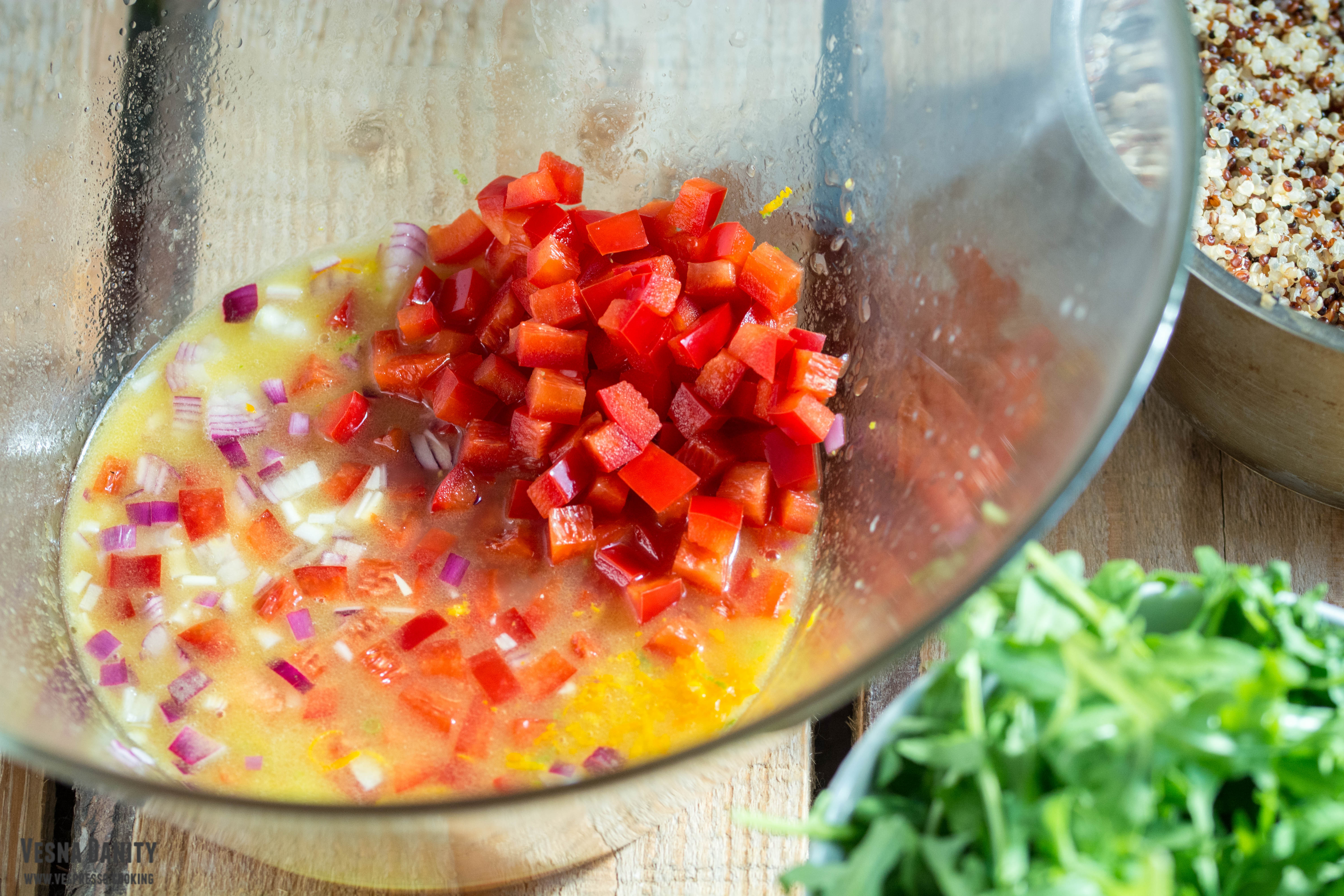 - Pregătirea ingredientelor umede. Într-un bol am amestecat iaurtul de soia cu uleiul, extractul de vanilie și semințele de in rehidratate.